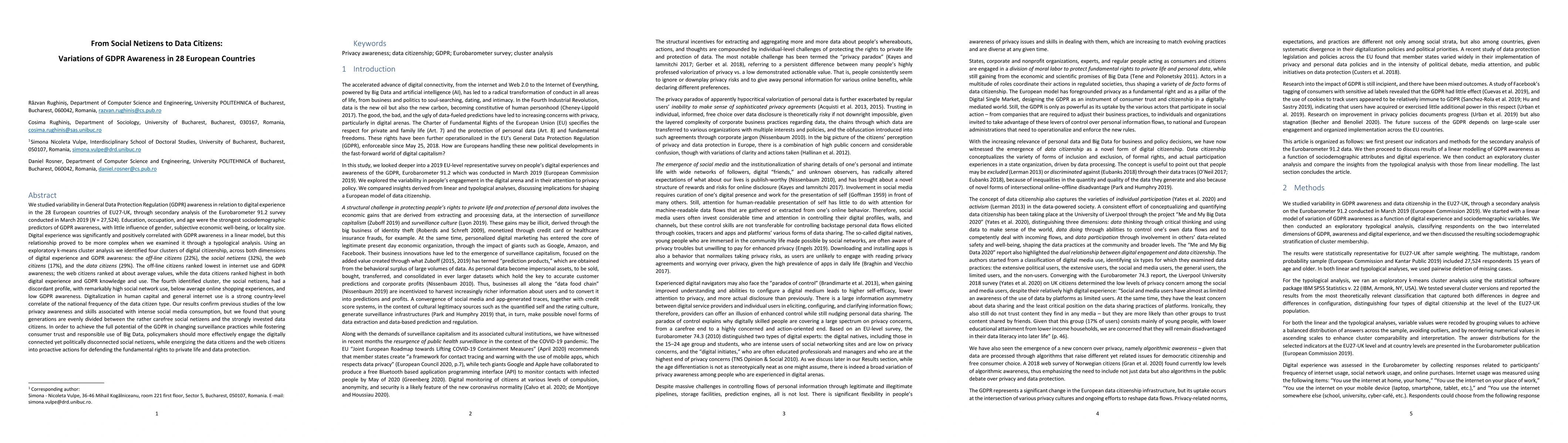 We studied variability in General Data Protection Regulation (GDPR) awareness in relation to digital experience in the 28 European countries of EU27-UK, through secondary analysis of the Eurobarometer 91.2 survey conducted in March 2019 (N = 27,524). Education, occupation, and age were the strongest sociodemographic predictors of GDPR awareness, with little influence of gender, subjective economic well-being, or locality size. Digital experience was significantly and positively correlated with GDPR awareness in a linear model, but this relationship proved to be more complex when we examined it through a typological analysis. Using an exploratory k-means cluster analysis we identified four clusters of digital citizenship, across both dimensions of digital experience and GDPR awareness: the off-line citizens (22%), the social netizens (32%), the web citizens (17%), and the data citizens (29%). The off-line citizens ranked lowest in internet use and GDPR awareness; the web citizens ranked at about average values, while the data citizens ranked highest in both digital experience and GDPR knowledge and use. The fourth identified cluster, the social netizens, had a discordant profile, with remarkably high social network use, below average online shopping experiences, and low GDPR awareness. Digitalization in human capital and general internet use is a strong country-level correlate of the national frequency of the data citizen type. Our results confirm previous studies of the low privacy awareness and skills associated with intense social media consumption, but we found that young generations are evenly divided between the rather carefree social netizens and the strongly invested data citizens.