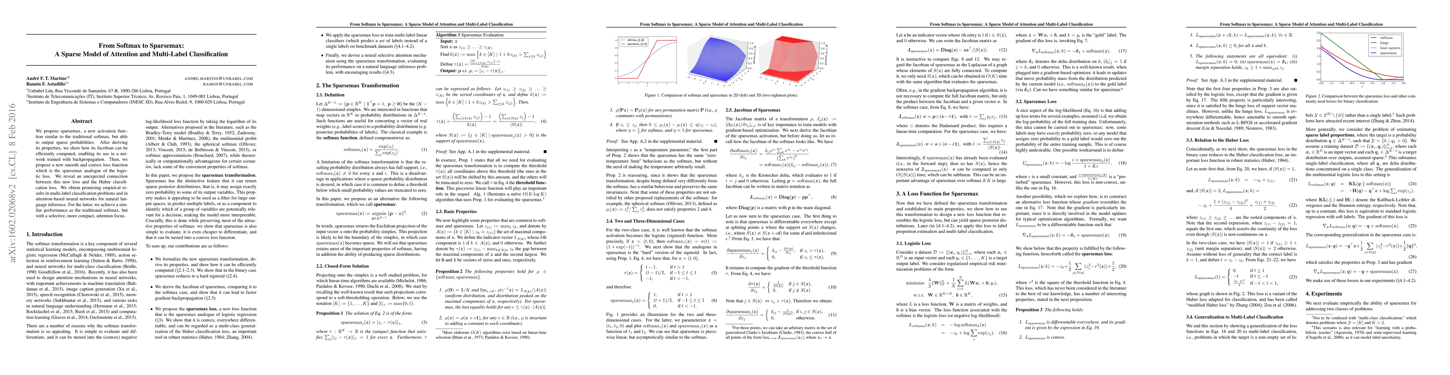 This paper introduces sparsemax, a sparse activation function that generates sparse probabilities, and proposes a corresponding loss function. It demonstrates efficient Jacobian computation and shows promising results in multi-label classification and attention-based neural networks, achieving similar performance to softmax with a more focused attention.