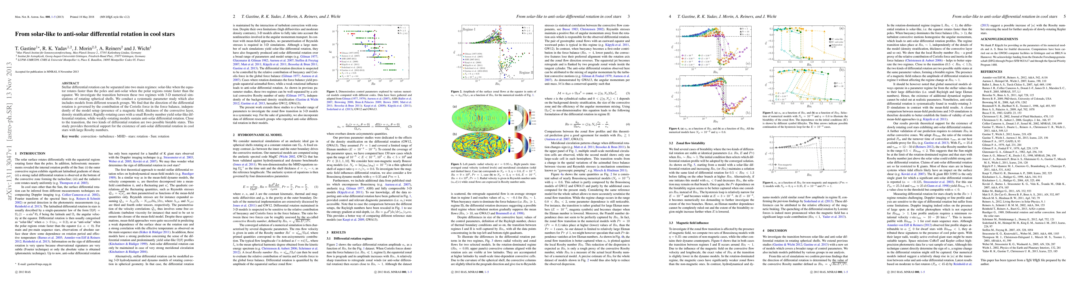 This paper explores the transition between solar-like and anti-solar differential rotation in cool stars using 3-D numerical simulations. It finds that the Coriolis force's contribution governs the rotation type, with solar-like rotation in fast rotators and anti-solar in slow rotators, supporting the existence of anti-solar rotation in stars with large Rossby numbers.