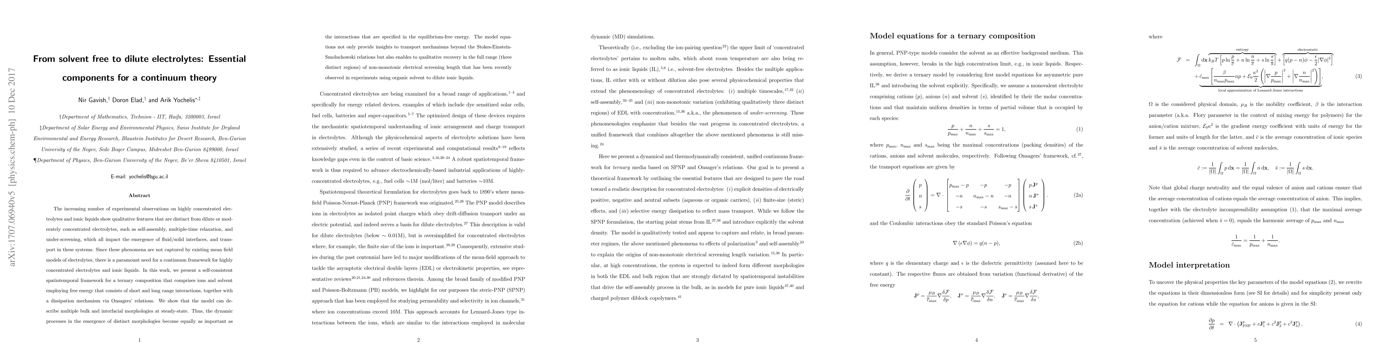 The increasing number of experimental observations on highly concentrated electrolytes and ionic liquids show qualitative features that are distinct from dilute or moderately concentrated electrolytes, such as self-assembly, multiple-time relaxation, and under-screening, which all impact the emergence of fluid/solid interfaces, and transport in these systems. Since these phenomena are not captured by existing mean field models of electrolytes, there is a paramount need for a continuum framework for highly concentrated electrolytes and ionic liquids. In this work, we present a self-consistent spatiotemporal framework for a ternary composition that comprises ions and solvent employing free energy that consists of short and long range interactions, together with a dissipation mechanism via Onsagers' relations. We show that the model can describe multiple bulk and interfacial morphologies at steady-state. Thus, the dynamic processes in the emergence of distinct morphologies become equally as important as the interactions that are specified in the equilibrium-free energy. The model equations not only provide insights to transport mechanisms beyond the Stokes-Einstein-Smoluchowski relations but also enables to qualitative recovery in the full range (three distinct regions) of non-monotonic electrical screening length that has been recently observed in experiments using organic solvent to dilute ionic liquids.