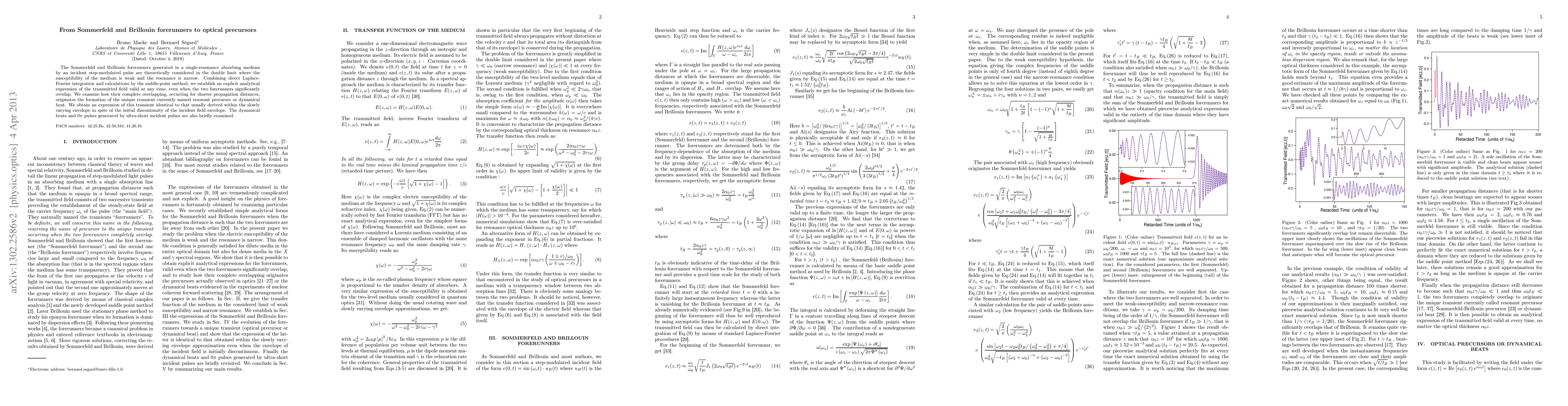 The Sommerfeld and Brillouin forerunners generated in a single-resonance absorbing medium by an incident step-modulated pulse are theoretically considered in the double limit where the susceptibility of the medium is weak and the resonance is narrow. Combining direct Laplace-Fourier integration and calculations by the saddle-point method, we establish an explicit analytical expression of the transmitted field valid at any time, even when the two forerunners significantly overlap. We examine how their complete overlapping, occurring for shorter propagation distances, originates the formation of the unique transient currently named resonant precursor or dynamical beat. We obtain an expression of this transient identical to that usually derived within the slowly varying envelope in spite of the initial discontinuity of the incident field envelope. The dynamical beats and 0Pi pulses generated by ultra-short incident pulses are also briefly examined