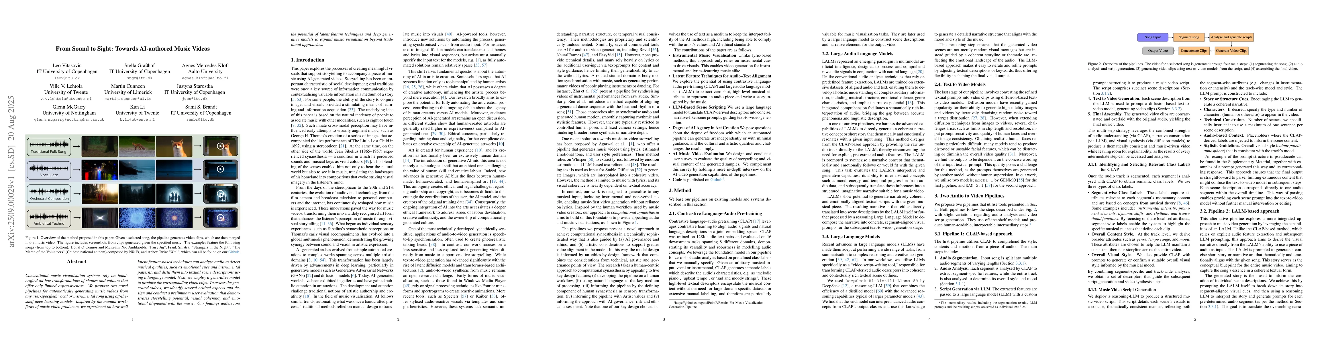 Conventional music visualisation systems rely on handcrafted ad hoc transformations of shapes and colours that offer only limited expressiveness. We propose two novel pipelines for automatically generating music videos from any user-specified, vocal or instrumental song using off-the-shelf deep learning models. Inspired by the manual workflows of music video producers, we experiment on how well latent feature-based techniques can analyse audio to detect musical qualities, such as emotional cues and instrumental patterns, and distil them into textual scene descriptions using a language model. Next, we employ a generative model to produce the corresponding video clips. To assess the generated videos, we identify several critical aspects and design and conduct a preliminary user evaluation that demonstrates storytelling potential, visual coherency and emotional alignment with the music. Our findings underscore the potential of latent feature techniques and deep generative models to expand music visualisation beyond traditional approaches.