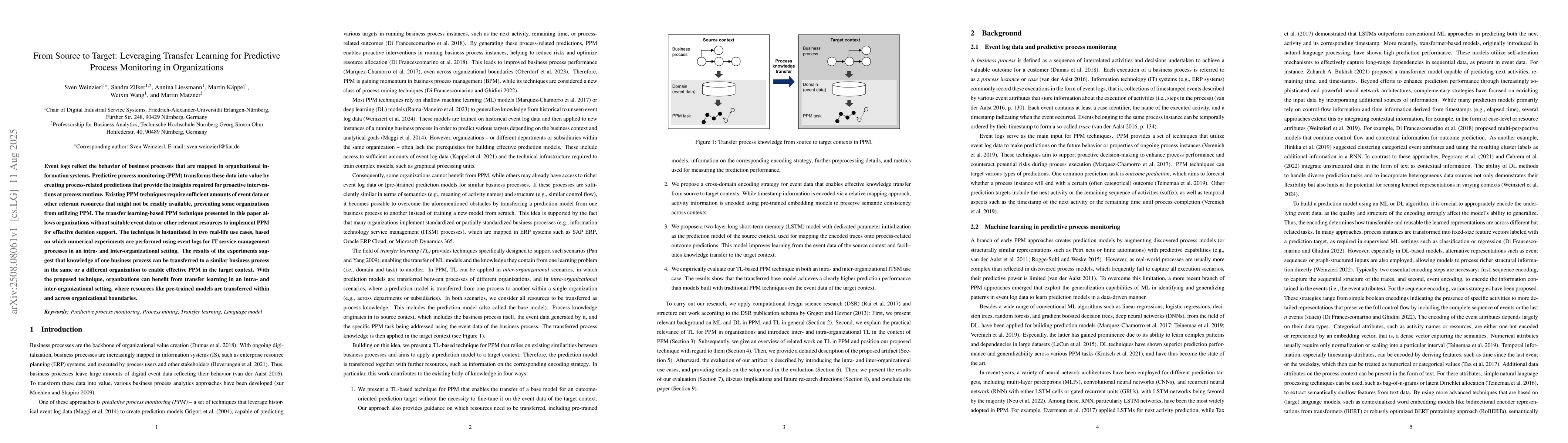 The research employs transfer learning for predictive process monitoring (PPM) in organizations using event logs from information systems. The technique involves transferring relevant resources, including pre-trained models for activity encoding and timestamp encoding, from a source context to a target context. The methodology is validated through numerical experiments using event logs for IT service management processes in both intra- and inter-organizational settings.