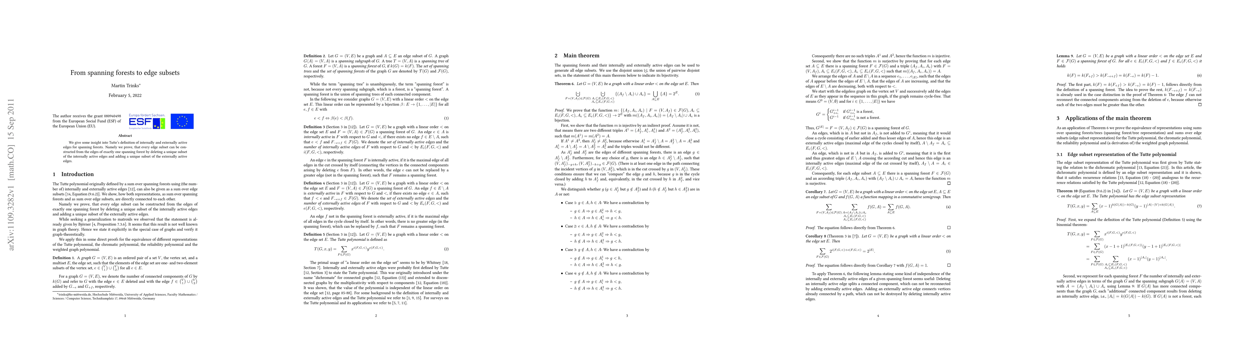 This paper explores Tutte's concept of internally and externally active edges in spanning forests, proving that any edge subset can be derived from a single spanning forest by removing a specific set of internally active edges and adding a distinct set of externally active edges. This provides a clear method for constructing edge subsets from spanning forests.