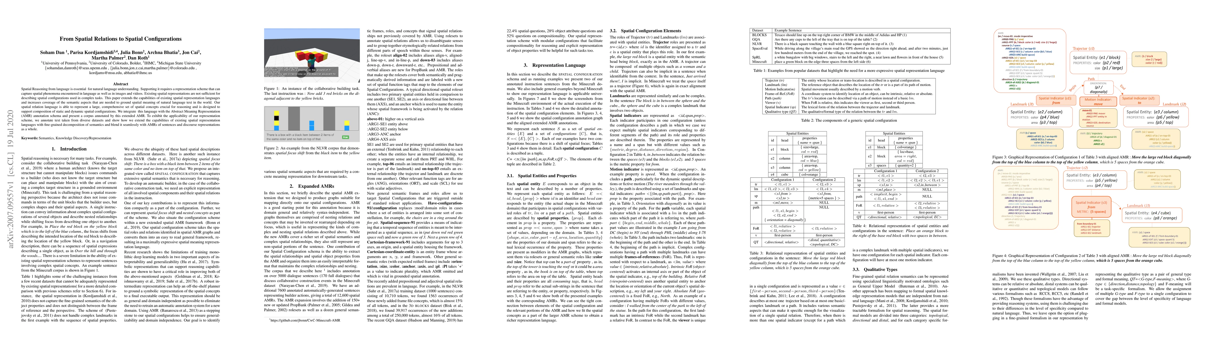 Spatial Reasoning from language is essential for natural language understanding. Supporting it requires a representation scheme that can capture spatial phenomena encountered in language as well as in images and videos. Existing spatial representations are not sufficient for describing spatial configurations used in complex tasks. This paper extends the capabilities of existing spatial representation languages and increases coverage of the semantic aspects that are needed to ground the spatial meaning of natural language text in the world. Our spatial relation language is able to represent a large, comprehensive set of spatial concepts crucial for reasoning and is designed to support the composition of static and dynamic spatial configurations. We integrate this language with the Abstract Meaning Representation(AMR) annotation schema and present a corpus annotated by this extended AMR. To exhibit the applicability of our representation scheme, we annotate text taken from diverse datasets and show how we extend the capabilities of existing spatial representation languages with the fine-grained decomposition of semantics and blend it seamlessly with AMRs of sentences and discourse representations as a whole.