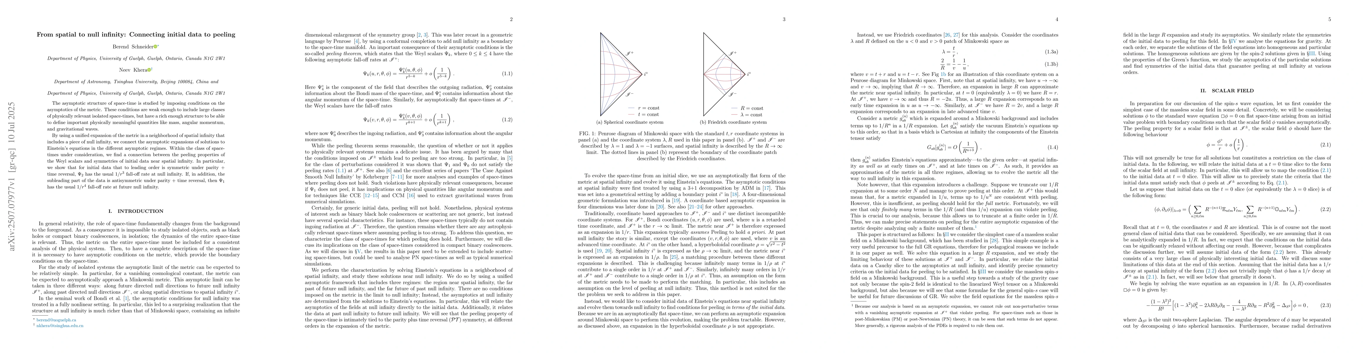 The asymptotic structure of space-time is studied by imposing conditions on the asymptotics of the metric. These conditions are weak enough to include large classes of physically relevant isolated space-times, but have a rich enough structure to be able to define important physically meaningful quantities like mass, angular momentum, and gravitational waves. By using a unified expansion of the metric in a neighborhood of spatial infinity that includes a piece of null infinity, we connect the asymptotic expansions of solutions to Einstein's equations in the different asymptotic regimes. Within the class of space-times under consideration, we find a connection between the peeling properties of the Weyl scalars and symmetries of initial data near spatial infinity. In particular, we show that for initial data that to leading order is symmetric under parity + time reversal, $\Psi_2$ has the usual $1/r^3$ fall-off rate at null infinity. If, in addition, the subleading part of the data is antisymmetric under parity + time reversal, then $\Psi_1$ has the usual $1/r^4$ fall-off rate at future null infinity.