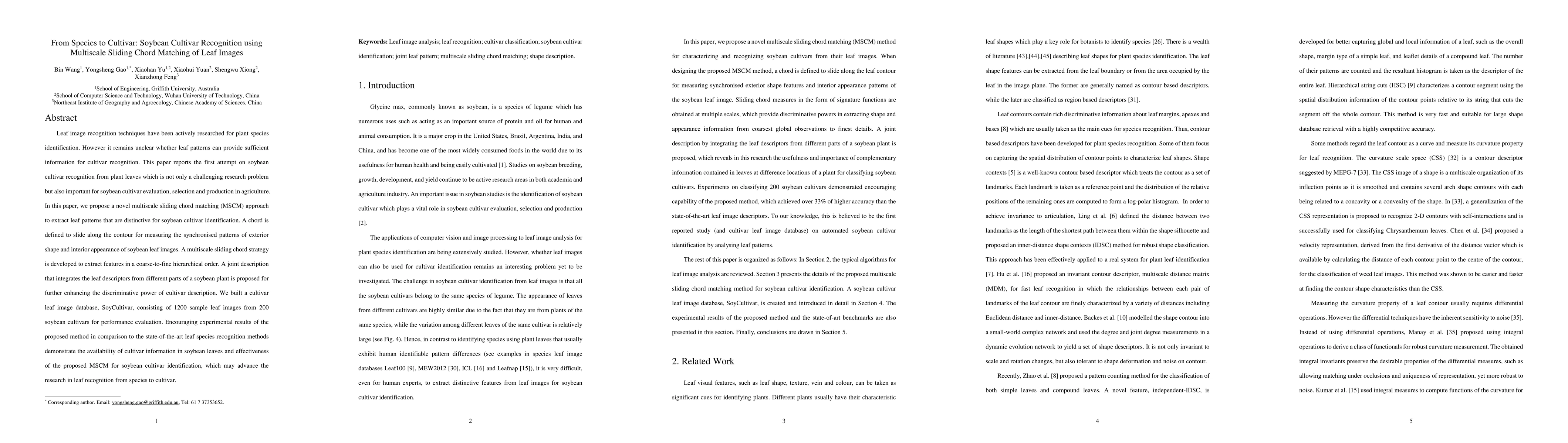 The research proposes a novel Multiscale Sliding Chord Matching (MSCM) method for soybean cultivar identification, which extracts discriminative cultivar features from soybean leaf images in a multiscale sliding chord manner, integrating leaf descriptors from different plant parts for enhanced characterization.