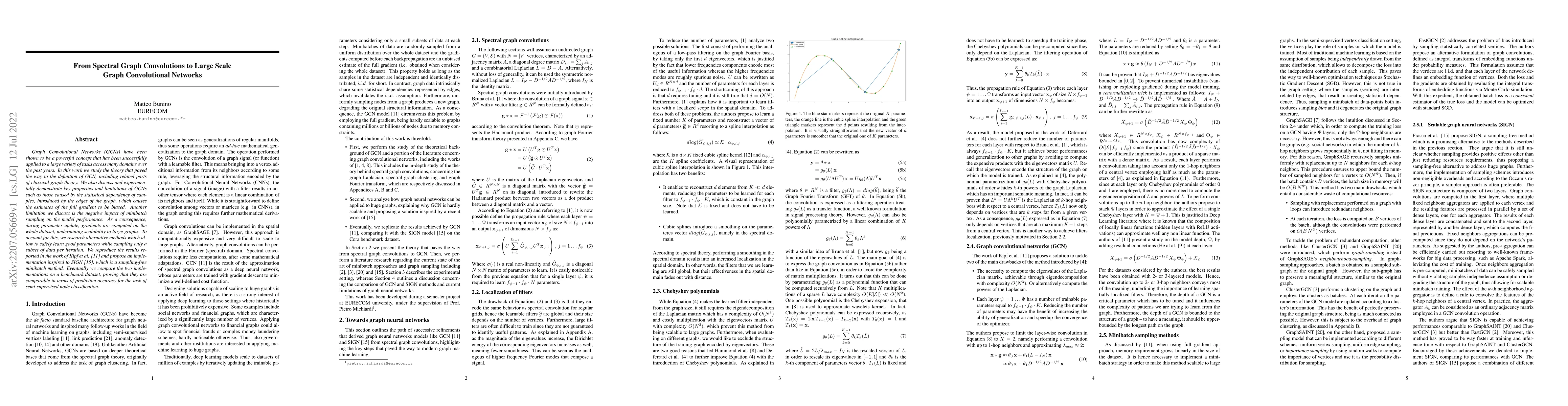 Graph Convolutional Networks (GCNs) have been shown to be a powerful concept that has been successfully applied to a large variety of tasks across many domains over the past years. In this work we study the theory that paved the way to the definition of GCN, including related parts of classical graph theory. We also discuss and experimentally demonstrate key properties and limitations of GCNs such as those caused by the statistical dependency of samples, introduced by the edges of the graph, which causes the estimates of the full gradient to be biased. Another limitation we discuss is the negative impact of minibatch sampling on the model performance. As a consequence, during parameter update, gradients are computed on the whole dataset, undermining scalability to large graphs. To account for this, we research alternative methods which allow to safely learn good parameters while sampling only a subset of data per iteration. We reproduce the results reported in the work of Kipf et al. and propose an implementation inspired to SIGN, which is a sampling-free minibatch method. Eventually we compare the two implementations on a benchmark dataset, proving that they are comparable in terms of prediction accuracy for the task of semi-supervised node classification.