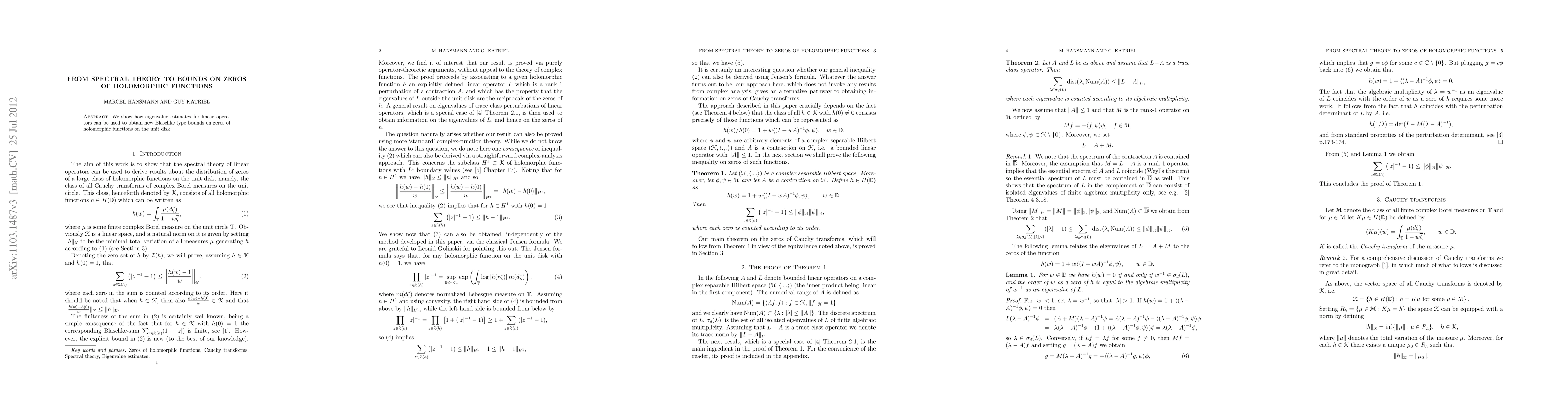 Summary: This paper demonstrates the application of eigenvalue estimates from spectral theory to derive new Blaschke type bounds on zeros of holomorphic functions within the unit disk. The results provide novel insights into the distribution of zeros based on operator theory.