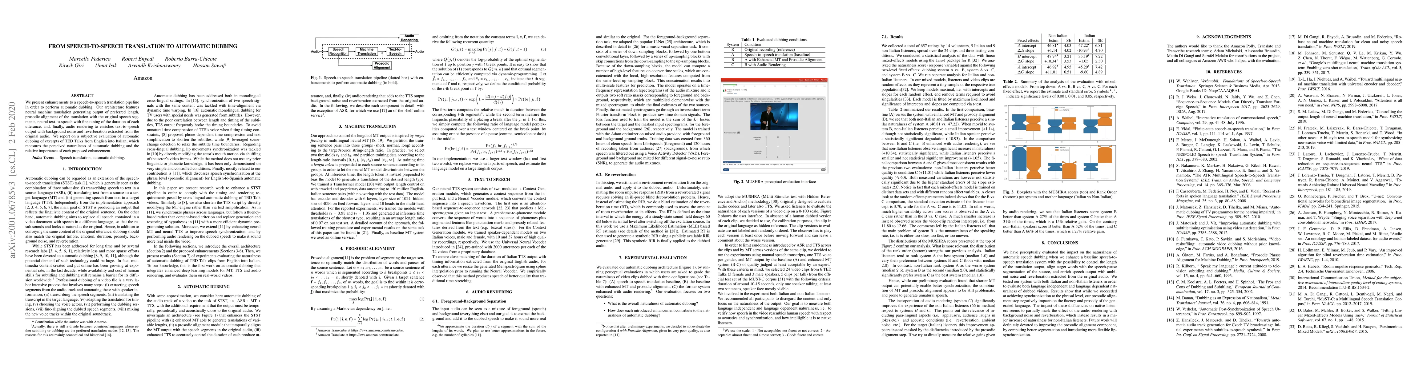 This paper enhances a speech-to-speech translation system for automatic dubbing, incorporating neural machine translation, prosodic alignment, fine-tuned text-to-speech, and audio rendering. A subjective evaluation assesses the naturalness of dubbing TED Talks from English to Italian, highlighting the importance of each enhancement.