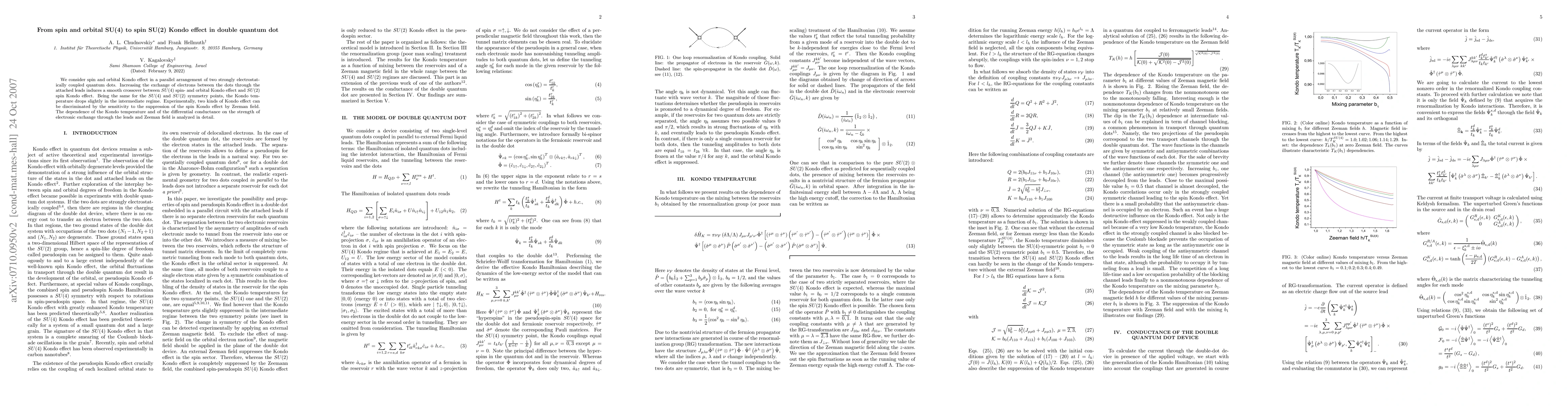 This research explores the transition from SU(4) spin- and orbital Kondo effect to SU(2) spin Kondo effect in a parallel double quantum dot system. The study analyzes how varying electron exchange between dots influences the Kondo temperature and conductance, with a focus on the distinct behaviors under Zeeman field suppression.