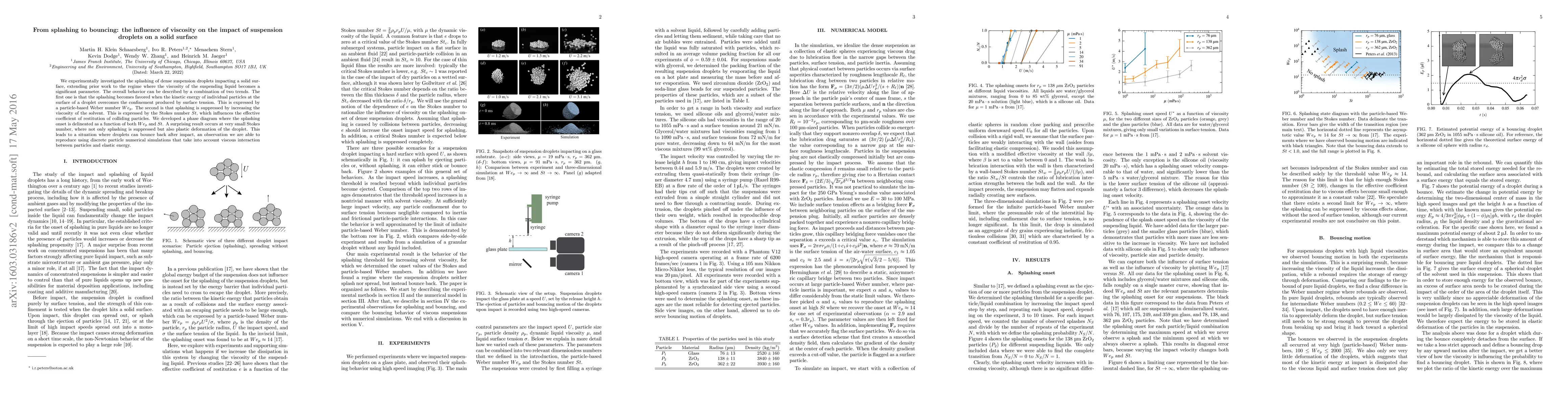 This study experimentally explores the impact dynamics of dense suspension droplets on a solid surface, revealing that splashing is favored when particle kinetic energy exceeds surface tension effects, while increased viscosity suppresses splashing and can lead to bouncing instead. The findings are mapped in a phase diagram using particle-based Weber and Stokes numbers.