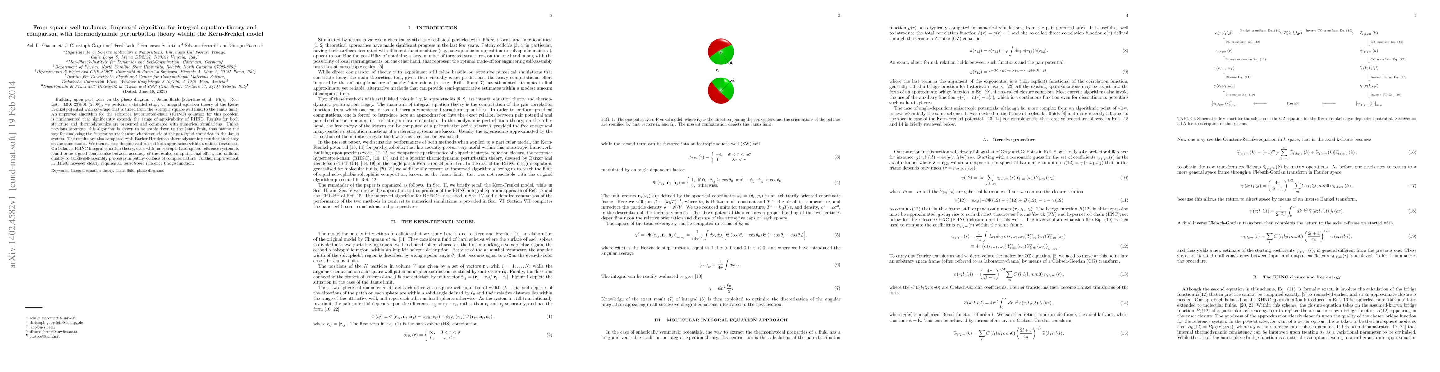 Building upon past work on the phase diagram of Janus fluids [Sciortino et al., Phys. Rev. Lett. \textbf{103}, 237801 (2009)], we perform a detailed study of integral equation theory of the Kern-Frenkel potential with coverage that is tuned from the isotropic square-well fluid to the Janus limit. An improved algorithm for the reference hypernetted-chain (RHNC) equation for this problem is implemented that significantly extends the range of applicability of RHNC. Results for both structure and thermodynamics are presented and compared with numerical simulations. Unlike previous attempts, this algorithm is shown to be stable down to the Janus limit, thus paving the way for analyzing the frustration mechanism characteristic of the gas-liquid transition in the Janus system. The results are also compared with Barker-Henderson thermodynamic perturbation theory on the same model. We then discuss the pros and cons of both approaches within a unified treatment. On balance, RHNC integral equation theory, even with an isotropic hard-sphere reference system, is found to be a good compromise between accuracy of the results, computational effort, and uniform quality to tackle self-assembly processes in patchy colloids of complex nature. Further improvement in RHNC however clearly requires an \emph{anisotropic} reference bridge function.