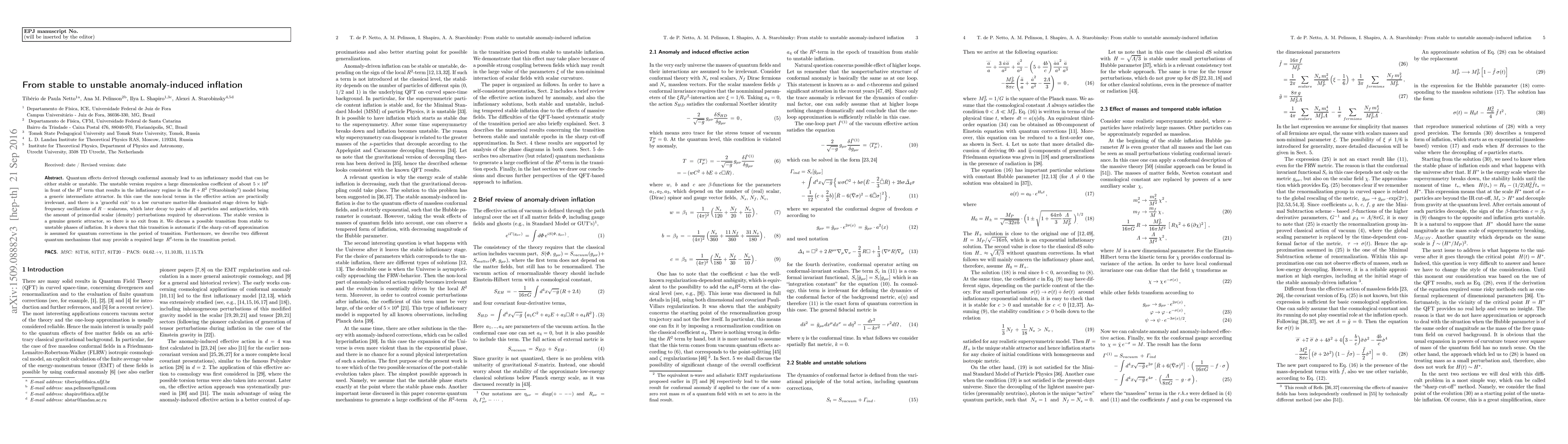 Quantum effects derived through conformal anomaly lead to an inflationary model that can be either stable or unstable. The unstable version requires a large dimensionless coefficient of about $5\times 10^8$ in front of the $R^2$ term that results in the inflationary regime in the $R+R^2$ ("Starobinsky") model being a generic intermediate attractor. In this case the non-local terms in the effective action are practically irrelevant, and there is a 'graceful exit' to a low curvature matter-like dominated stage driven by high-frequency oscillations of $R$ -- scalarons, which later decay to pairs of all particles and antiparticles, with the amount of primordial scalar (density) perturbations required by observations. The stable version is a genuine generic attractor, so there is no exit from it. We discuss a possible transition from stable to unstable phases of inflation. It is shown that this transition is automatic if the sharp cut-off approximation is assumed for quantum corrections in the period of transition. Furthermore, we describe two different quantum mechanisms that may provide a required large $\,R^2$-term in the transition period.