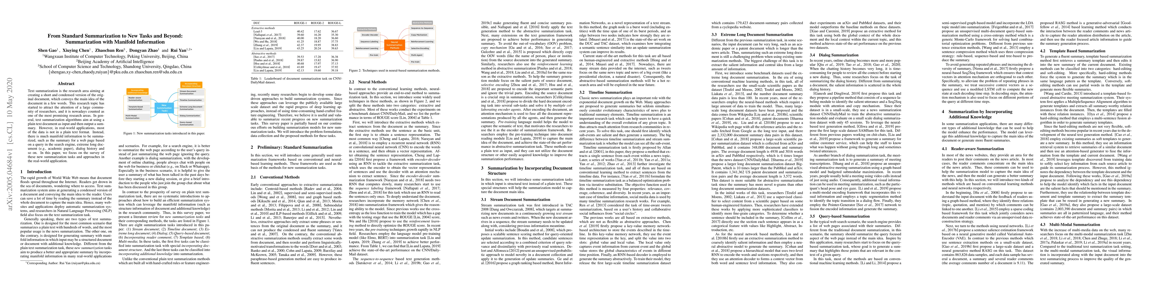 This paper surveys new tasks and approaches in text summarization beyond traditional methods, focusing on manifold information types like web page summaries from search queries, long documents, and dialog history, highlighting their real-world applications.