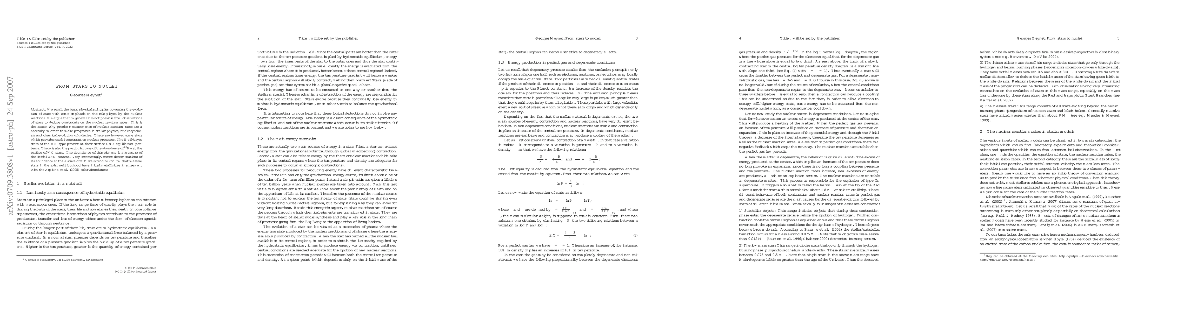 We recall the basic physical principles governing the evolution of stars with some emphasis on the role played by the nuclear reactions. We argue that in general it is not possible from observations of stars to deduce constraints on the nuclear reaction rates. This is the reason why precise measurements of nuclear reaction rates are a necessity in order to make progresses in stellar physics, nucleosynthesis and chemical evolution of galaxies. There are however some stars which provides useful constraint on nuclear processes. The Wolf-Rayet stars of the WN type present at their surface CNO equilibrium patterns. There is also the particular case of the abundance of $^{22}$Ne at the surface of WC stars. The abundance of this element is a measure of the initial CNO content. Very interestingly, recent determinations of its abundance at the surface of WC stars tend to confirm that massive stars in the solar neighborhood have initial metallicities in agreement with the Asplund et al. (2005) solar abundances.
