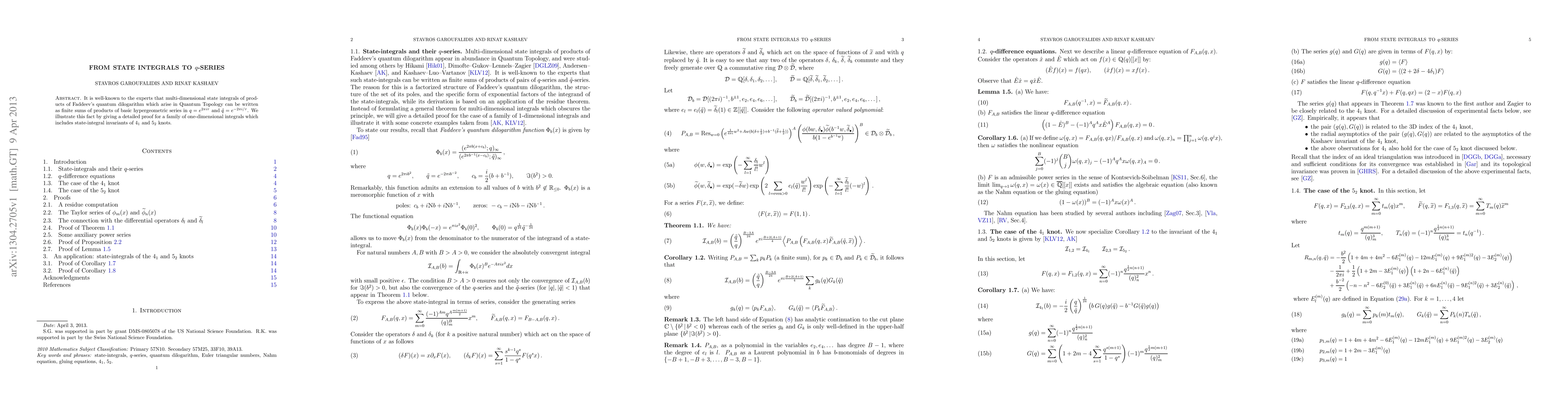 It is well-known to the experts that multi-dimensional state integrals of products of Faddeev's quantum dilogarithm which arise in Quantum Topology can be written as finite sums of products of basic hypergeometric series in q=e^{2\pi i\tau} and \tilde{q}=e^{-2\pi i/\tau}. We illustrate this fact by giving a detailed proof for a family of one-dimensional integrals which includes state-integral invariants of 4_1 and 5_2 knots.