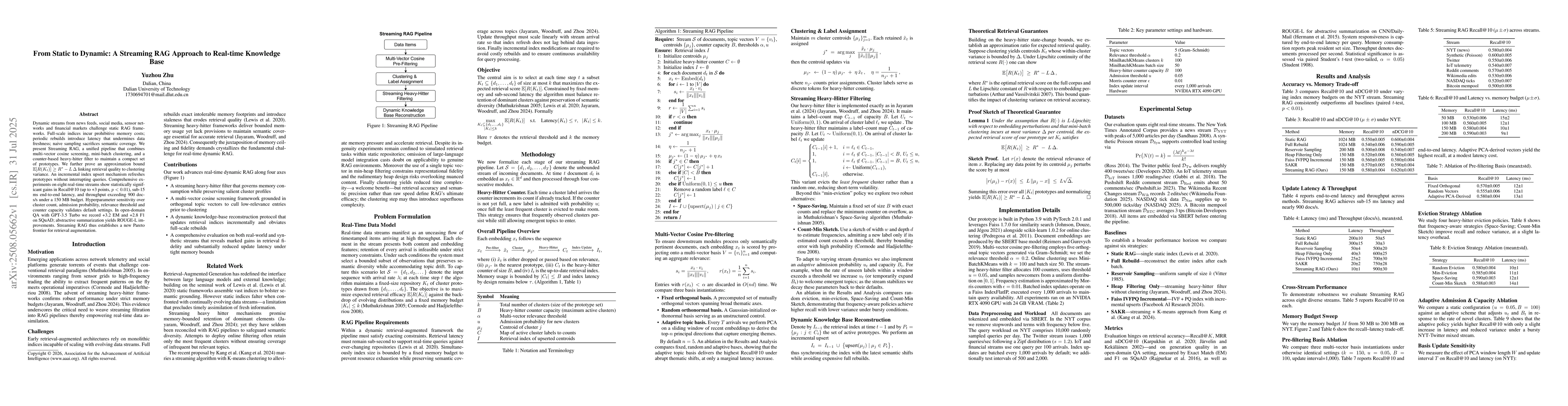 Dynamic streams from news feeds, social media, sensor networks, and financial markets challenge static RAG frameworks. Full-scale indices incur high memory costs; periodic rebuilds introduce latency that undermines data freshness; naive sampling sacrifices semantic coverage. We present Streaming RAG, a unified pipeline that combines multi-vector cosine screening, mini-batch clustering, and a counter-based heavy-hitter filter to maintain a compact prototype set. We further prove an approximation bound \$E\[R(K\_t)] \ge R^\* - L \Delta\$ linking retrieval quality to clustering variance. An incremental index upsert mechanism refreshes prototypes without interrupting queries. Experiments on eight real-time streams show statistically significant gains in Recall\@10 (up to 3 points, p < 0.01), end-to-end latency below 15 ms, and throughput above 900 documents per second under a 150 MB budget. Hyperparameter sensitivity analysis over cluster count, admission probability, relevance threshold, and counter capacity validates default settings. In open-domain question answering with GPT-3.5 Turbo, we record 3.2-point gain in Exact Match and 2.8-point gain in F1 on SQuAD; abstractive summarization yields ROUGE-L improvements. Streaming RAG establishes a new Pareto frontier for retrieval augmentation.