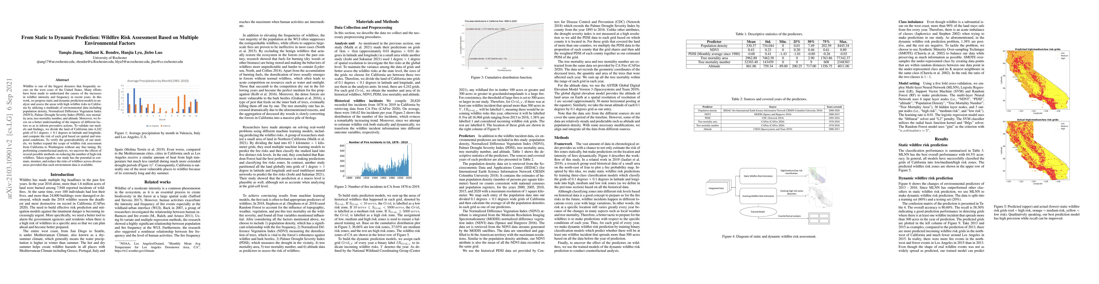 Wildfire is one of the biggest disasters that frequently occurs on the west coast of the United States. Many efforts have been made to understand the causes of the increases in wildfire intensity and frequency in recent years. In this work, we propose static and dynamic prediction models to analyze and assess the areas with high wildfire risks in California by utilizing a multitude of environmental data including population density, Normalized Difference Vegetation Index (NDVI), Palmer Drought Severity Index (PDSI), tree mortality area, tree mortality number, and altitude. Moreover, we focus on a better understanding of the impacts of different factors so as to inform preventive actions. To validate our models and findings, we divide the land of California into 4,242 grids of 0.1 degrees $\times$ 0.1 degrees in latitude and longitude, and compute the risk of each grid based on spatial and temporal conditions. To verify the generalizability of our models, we further expand the scope of wildfire risk assessment from California to Washington without any fine tuning. By performing counterfactual analysis, we uncover the effects of several possible methods on reducing the number of high risk wildfires. Taken together, our study has the potential to estimate, monitor, and reduce the risks of wildfires across diverse areas provided that such environment data is available.