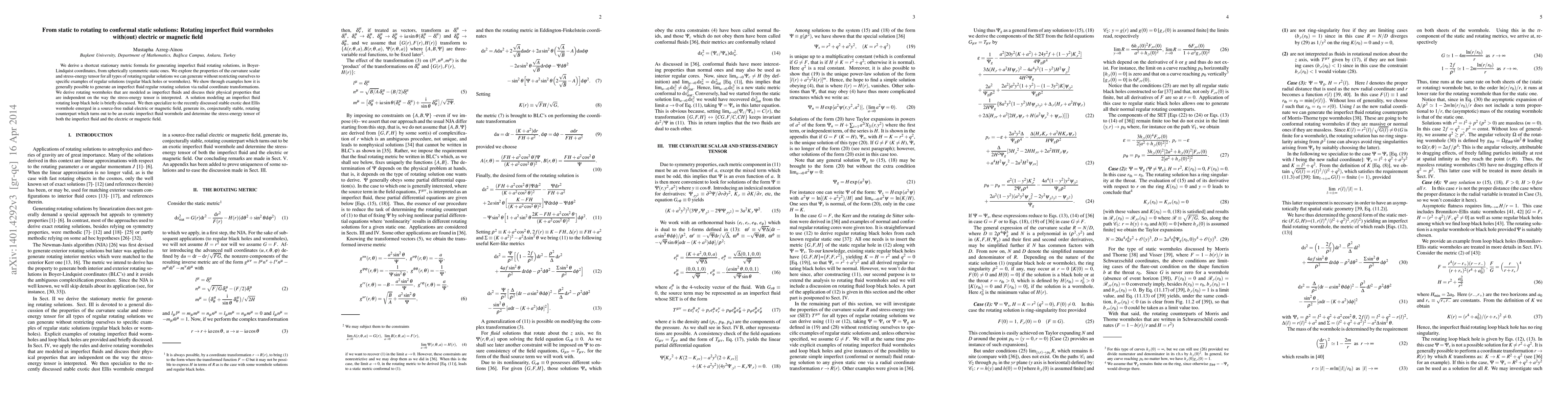 We derive a shortcut stationary metric formula for generating imperfect fluid rotating solutions, in Boyer-Lindquist coordinates, from spherically symmetric static ones. We explore the properties of the curvature scalar and stress-energy tensor for all types of rotating regular solutions we can generate without restricting ourselves to specific examples of regular solutions (regular black holes or wormholes). We show through examples how it is generally possible to generate an imperfect fluid regular rotating solution via radial coordinate transformations. We derive rotating wormholes that are modeled as imperfect fluids and discuss their physical properties that are independent on the way the stress-energy tensor is interpreted. A solution modeling an imperfect fluid rotating loop black hole is briefly discussed. We then specialize to the recently discussed stable exotic dust Ellis wormhole emerged in a source-free radial electric or magnetic field, generate its, conjecturally stable, rotating counterpart which turns out to be an exotic imperfect fluid wormhole and determine the stress-energy tensor of both the imperfect fluid and the electric or magnetic field.