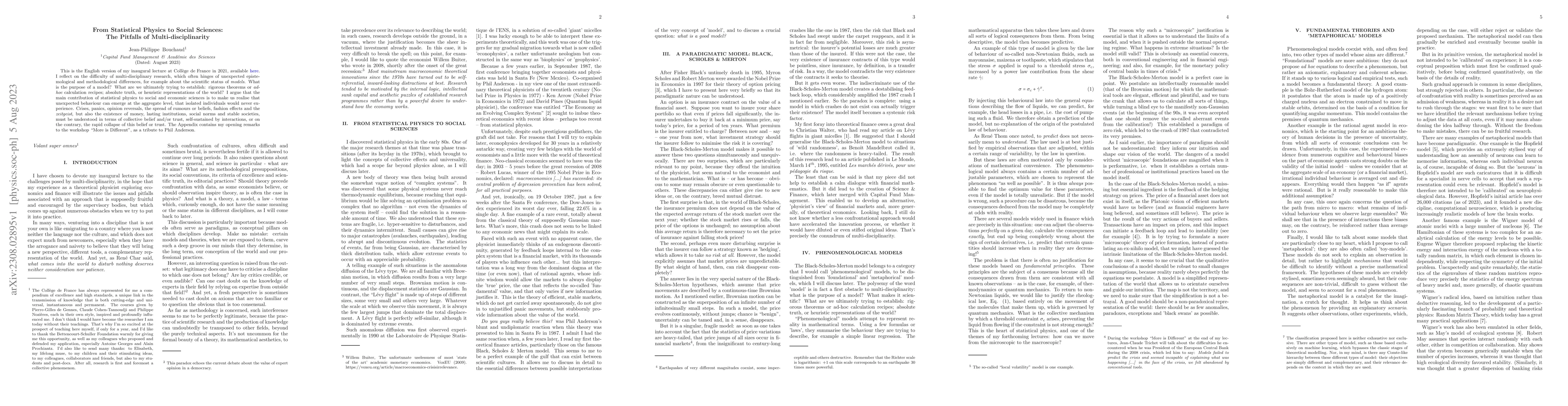 This is the English version of my inaugural lecture at Coll\`ege de France in 2021, available at https://www.youtube.com/watch?v=bxktplKMhKU. I reflect on the difficulty of multi-disciplinary research, which often hinges of unexpected epistemological and methodological differences, for example about the scientific status of models. What is the purpose of a model? What are we ultimately trying to establish: rigorous theorems or ad-hoc calculation recipes; absolute truth, or heuristic representations of the world? I argue that the main contribution of statistical physics to social and economic sciences is to make us realise that unexpected behaviour can emerge at the aggregate level, that isolated individuals would never experience. Crises, panics, opinion reversals, the spread of rumours or beliefs, fashion effects and the zeitgeist, but also the existence of money, lasting institutions, social norms and stable societies, must be understood in terms of collective belief and/or trust, self-sustained by interactions, or on the contrary, the rapid collapse of this belief or trust. The Appendix contains my opening remarks to the workshop ``More is Different'', as a tribute to Phil Anderson.