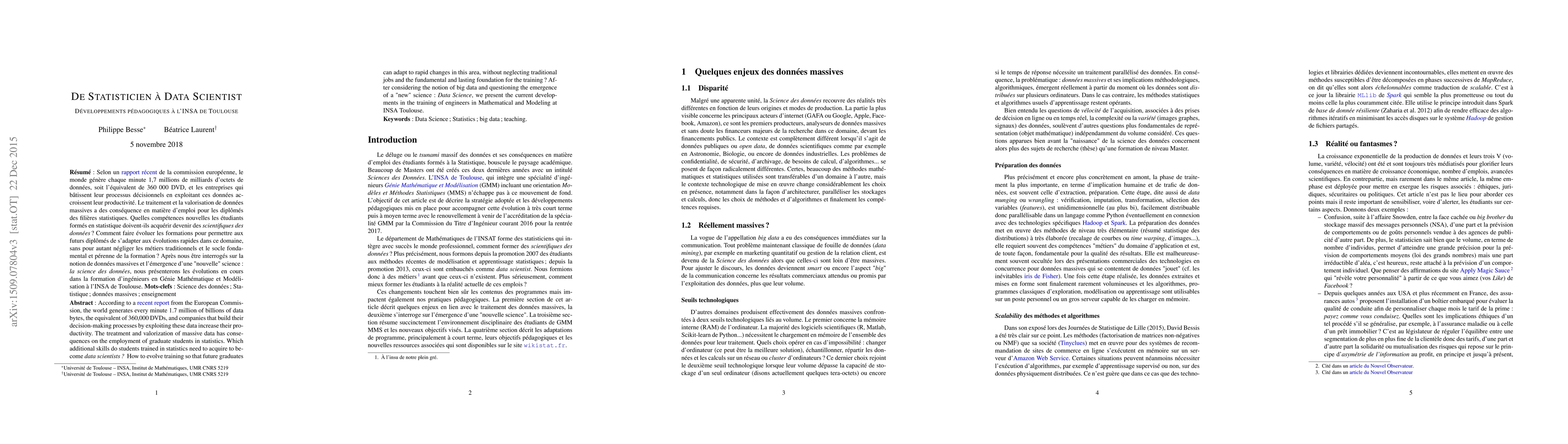According to a recent report from the European Commission, the world generates every minute 1.7 million of billions of data bytes, the equivalent of 360,000 DVDs, and companies that build their decision-making processes by exploiting these data increase their productivity. The treatment and valorization of massive data has consequences on the employment of graduate students in statistics. Which additional skills do students trained in statistics need to acquire to become data scientists ? How to evolve training so that future graduates can adapt to rapid changes in this area, without neglecting traditional jobs and the fundamental and lasting foundation for the training? After considering the notion of big data and questioning the emergence of a "new" science: Data Science, we present the current developments in the training of engineers in Mathematical and Modeling at INSA Toulouse.