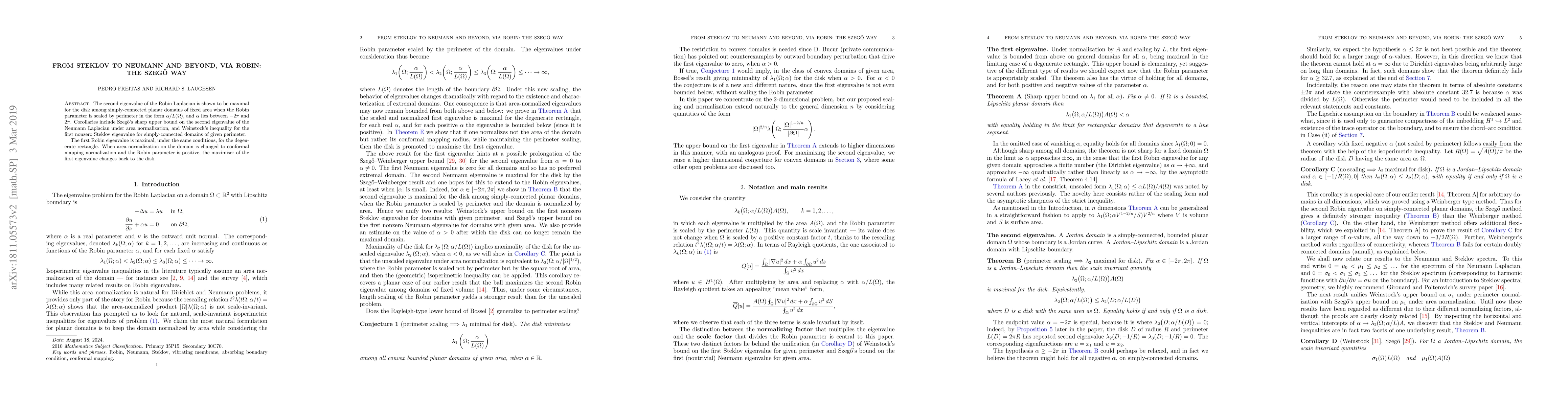 Summary: The paper demonstrates that the second eigenvalue of the Robin Laplacian is maximized for a disk among simply-connected planar domains of fixed area under specific scaling. It also establishes connections to Neumann and Steklov eigenvalues, revealing the maximizer for the first Robin eigenvalue and its shift under conformal mapping normalization.
