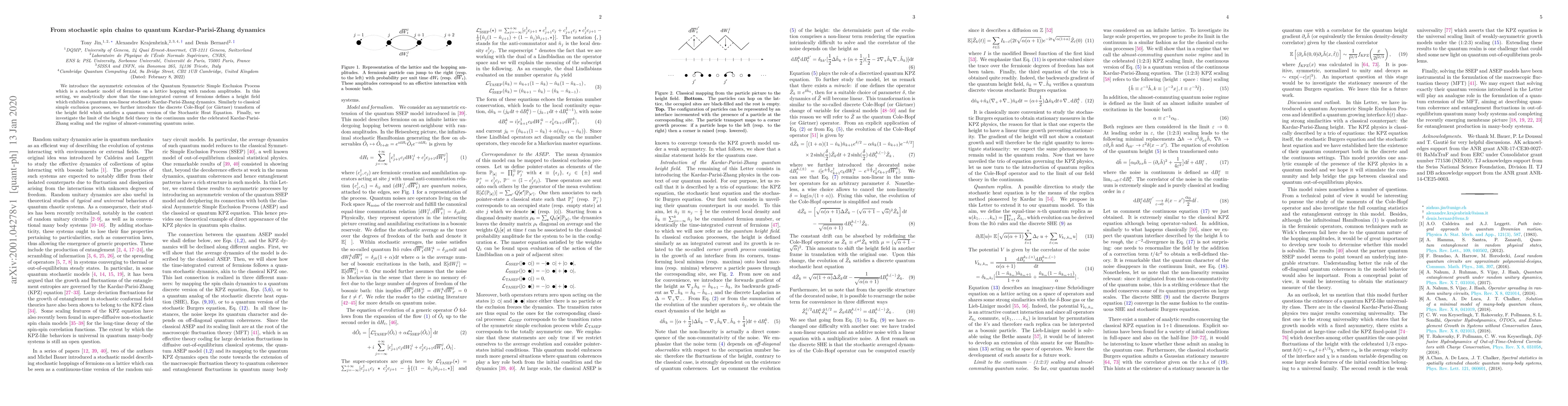 This paper extends the Quantum Symmetric Simple Exclusion Process to an asymmetric model, demonstrating that the time-integrated current of fermions follows a quantum non-linear stochastic Kardar-Parisi-Zhang dynamics. It also introduces a quantum version of the Stochastic Heat Equation via the discrete Cole-Hopf transform of the height field.