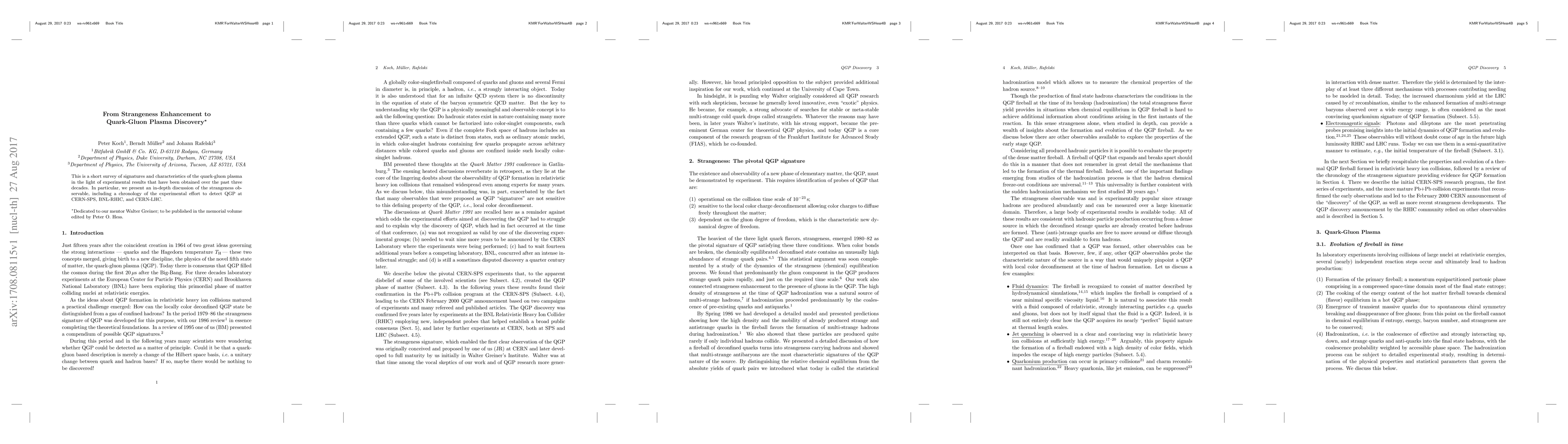 This is a short survey of signatures and characteristics of the quark-gluon plasma in the light of experimental results that have been obtained over the past three decades. In particular, we present an in-depth discussion of the strangeness observable, including a chronology of the experimental effort to detect QGP at CERN-SPS, BNL-RHIC, and CERN-LHC.