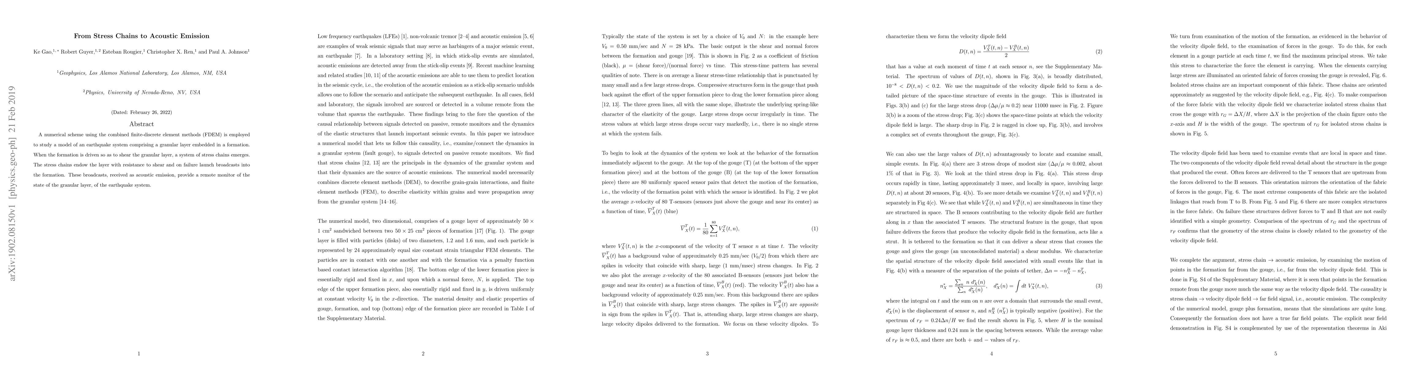 A numerical scheme using the combined finite-discrete element methods (FDEM) is employed to study a model of an earthquake system comprising a granular layer embedded in a formation. When the formation is driven so as to shear the granular layer, a system of stress chains emerges. The stress chains endow the layer with resistance to shear and on failure launch broadcasts into the formation. These broadcasts, received as acoustic emission, provide a remote monitor of the state of the granular layer, of the earthquake system.