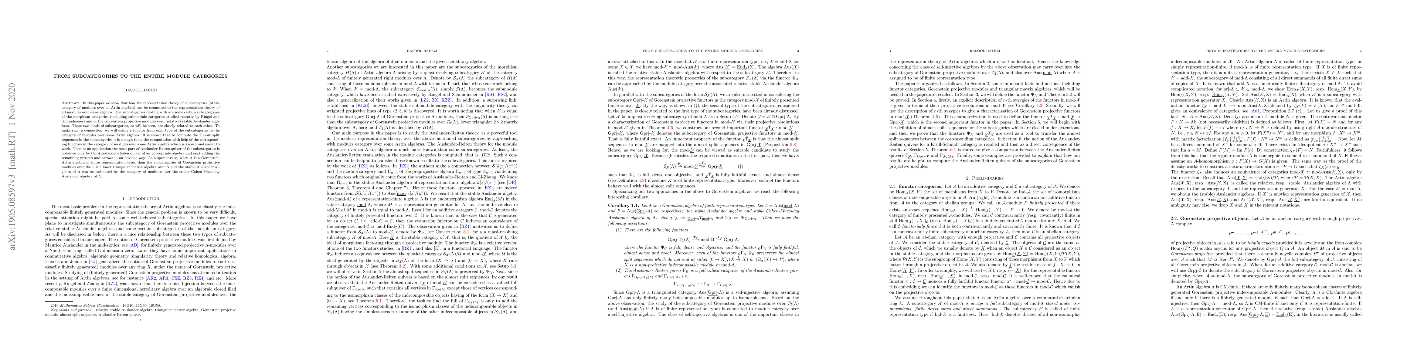This paper establishes a connection between the representation theory of specific subcategories of module categories over Artin algebras and the representation theory of the entire module category. It defines functors to simplify the computation of almost split sequences and demonstrates how the Auslander-Reiten quiver of these subcategories can be derived from that of an appropriate algebra.