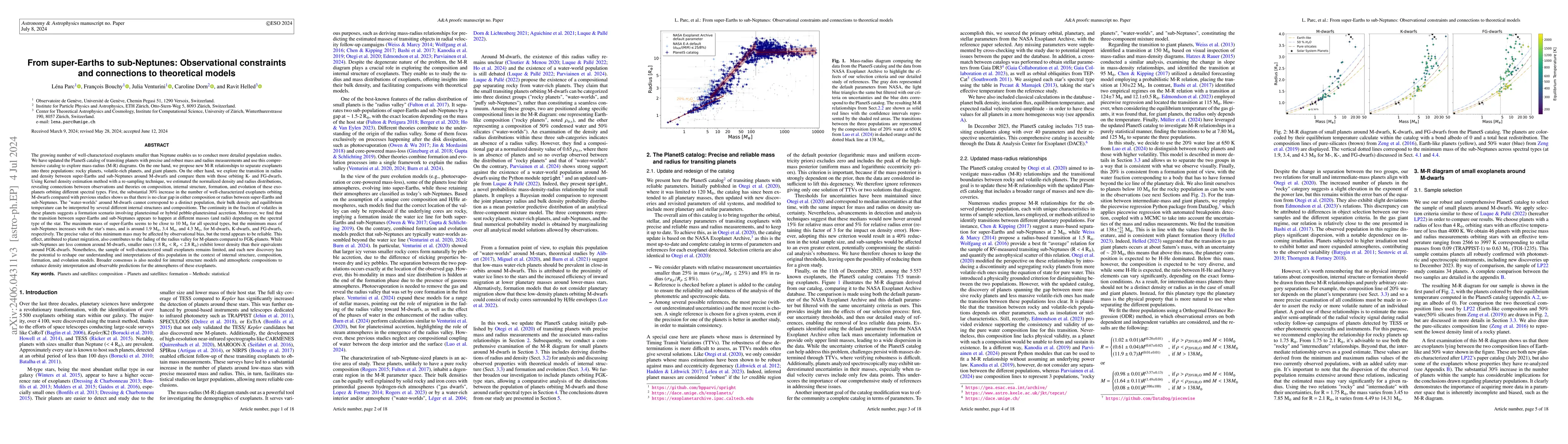 We update the PlanetS catalog of transiting planets with precise and robust mass and radius measurements and use this comprehensive catalog to explore Mass-Radius (M-R) diagrams. On one hand, we propose new M-R relationships to separate exoplanets into three populations. On the other hand, we explore the transition in radius and density between Super-Earths and Sub-Neptunes around M-dwarfs and compare it with those orbiting K- and FG-dwarfs. Using Kernel Density Estimation method with a re-sampling technique, we estimate the normalized density and radius distributions, revealing connections between observations and theories on composition, internal structure, formation, and evolution of these exoplanets orbiting different spectral types. Firstly, the substantial 30% increase in the number of well-characterized exoplanets orbiting M-dwarfs compared with previous studies shows us that there is no clear gap in either composition or radius between Super-Earths and Sub-Neptunes. The "water-worlds" around M-dwarfs cannot correspond to a distinct population, their bulk density and equilibrium temperature can be interpreted by several different internal structures and compositions. The continuity in the fraction of volatiles in these planets suggests a formation scenario involving planetesimal or hybrid pebble-planetesimal accretion. Moreover, we find that the transition between Super-Earths and Sub-Neptunes appears to happen at different mass (and radii) depending on the spectral type of the star. The maximum mass of Super-Earths seems to be close to 10 M$_\oplus$ for all spectral types, but the minimum mass of Sub-Neptunes increases with the star's mass. This effect also contributes to the fading of the radius valley for M-planets compared to FGK-planets. While Sub-Neptunes are less common around M-dwarfs, smaller ones exhibit lower density than their equivalents around FGK-dwarfs.