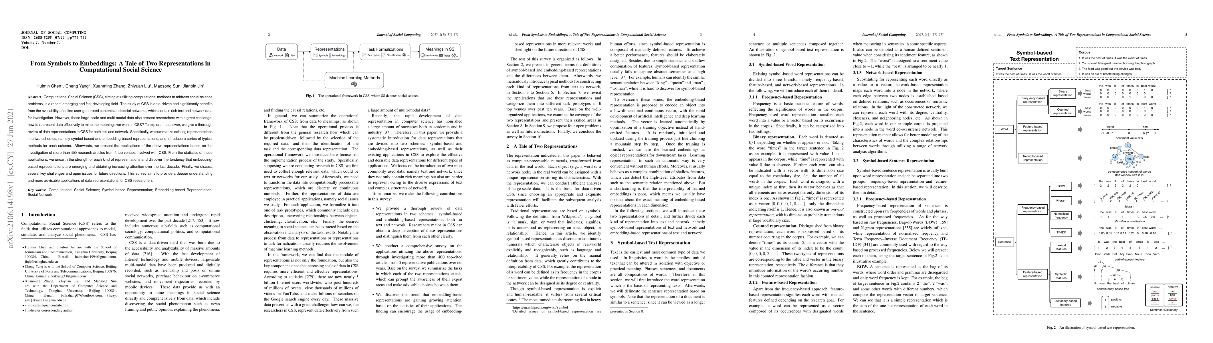 This paper reviews computational methods for representing data in Computational Social Science, distinguishing between symbol-based and embedding-based representations. It highlights the growing preference for embedding-based methods, revealing trends from an analysis of over 400 research articles, and discusses future challenges and open issues.