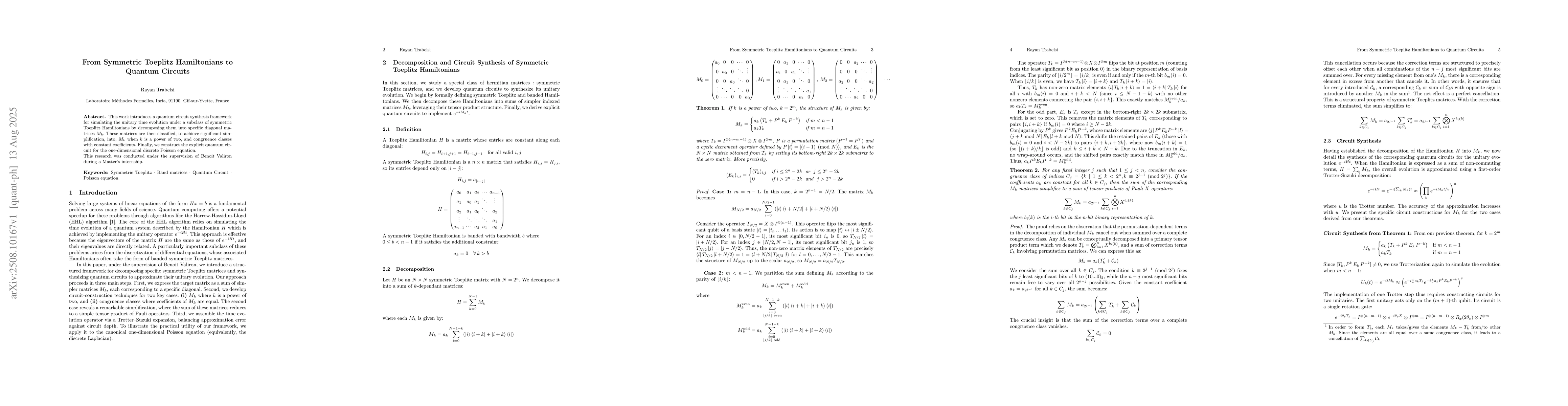 This work introduces a quantum circuit synthesis framework for simulating the unitary time evolution under a subclass of symmetric Toeplitz Hamiltonians by decomposing them into specific diagonal matrices $M_k$. These matrices are then classified, to achieve significant simplification, into, $M_k$ when $k$ is a power of two, and congruence classes with constant coefficients. Finally, we construct the explicit quantum circuit for the one-dimensional discrete Poisson equation. This research was conducted under the supervision of Benoit Valiron during a Master's internship.