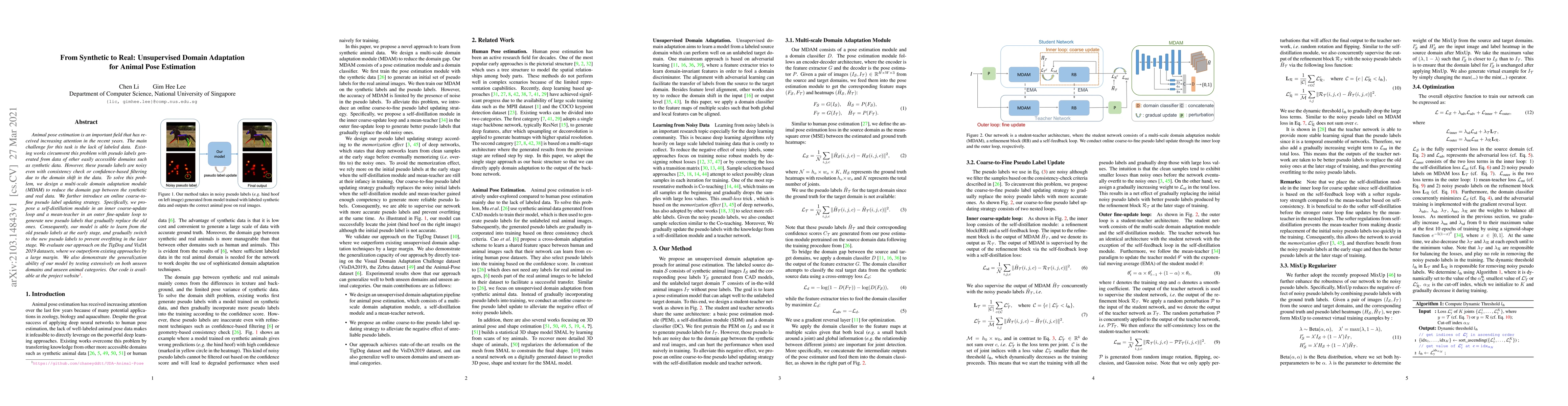 This paper introduces a multi-scale domain adaptation module (MDAM) to reduce the domain gap between synthetic and real animal pose data, improving pseudo label generation. An online coarse-to-fine updating strategy is proposed, using self-distillation and mean-teacher models to create increasingly accurate pseudo labels, outperforming existing methods on TigDog and VisDA 2019 datasets, and demonstrating strong generalization on unseen domains and categories.