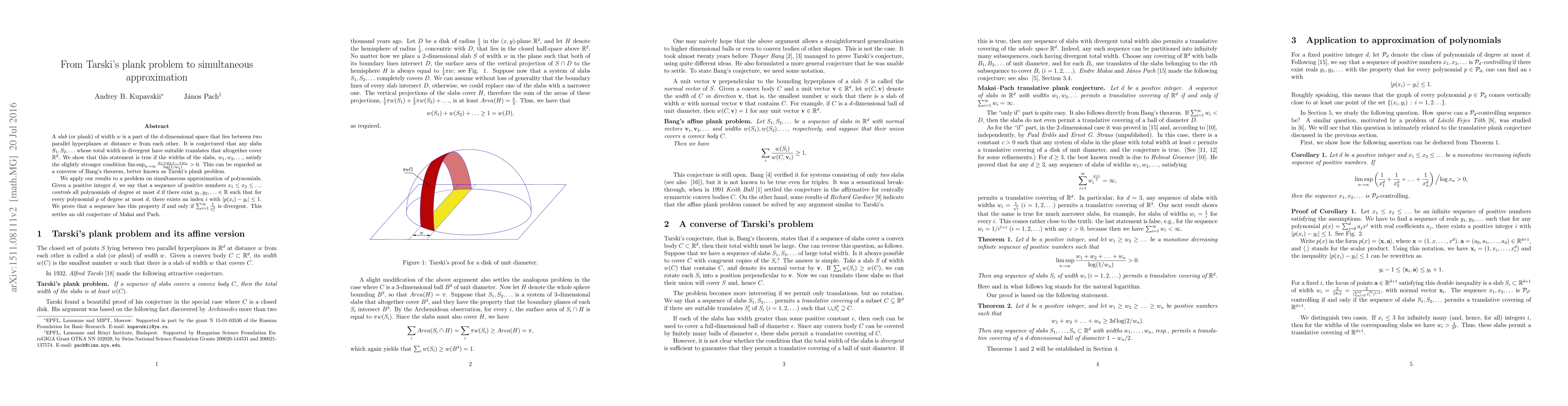 A {\em slab} (or plank) of width $w$ is a part of the $d$-dimensional space that lies between two parallel hyperplanes at distance $w$ from each other. It is conjectured that any slabs $S_1, S_2,\ldots$ whose total width is divergent have suitable translates that altogether cover $\mathbb{R}^d$. We show that this statement is true if the widths of the slabs, $w_1, w_2,\ldots$, satisfy the slightly stronger condition $\limsup_{n\rightarrow\infty}\frac{w_1+w_2+\ldots+w_n}{\log(1/w_n)}>0$. This can be regarded as a converse of Bang's theorem, better known as Tarski's plank problem. We apply our results to a problem on simultaneous approximation of polynomials. Given a positive integer $d$, we say that a sequence of positive numbers $x_1\le x_2\le\ldots$ {\em controls} all polynomials of degree at most $d$ if there exist $y_1, y_2,\ldots\in\mathbb{R}$ such that for every polynomial $p$ of degree at most $d$, there exists an index $i$ with $|p(x_i)-y_i|\leq 1.$ We prove that a sequence has this property if and only if $\sum_{i=1}^{\infty}\frac{1}{x_i^d}$ is divergent. This settles an old conjecture of Makai and Pach.