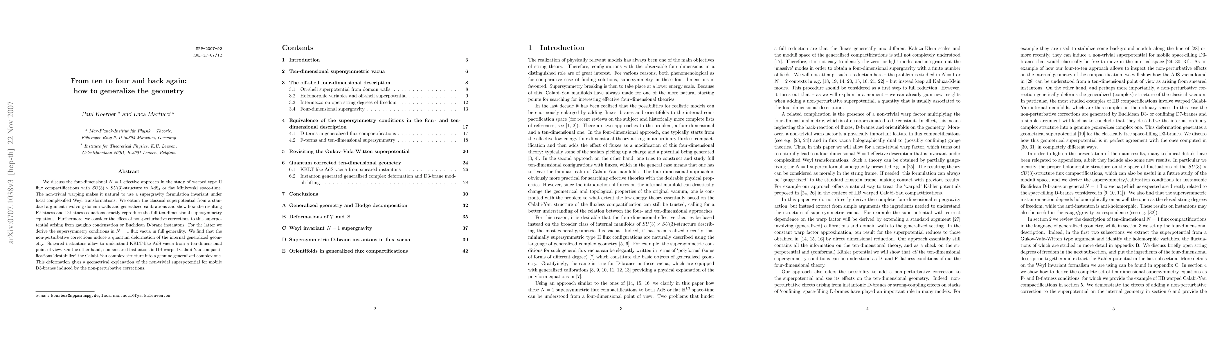 We discuss the four-dimensional N=1 effective approach in the study of warped type II flux compactifications with SU(3)x SU(3)-structure to AdS_4 or flat Minkowski space-time. The non-trivial warping makes it natural to use a supergravity formulation invariant under local complexified Weyl transformations. We obtain the classical superpotential from a standard argument involving domain walls and generalized calibrations and show how the resulting F-flatness and D-flatness equations exactly reproduce the full ten-dimensional supersymmetry equations. Furthermore, we consider the effect of non-perturbative corrections to this superpotential arising from gaugino condensation or Euclidean D-brane instantons. For the latter we derive the supersymmetry conditions in N=1 flux vacua in full generality. We find that the non-perturbative corrections induce a quantum deformation of the internal generalized geometry. Smeared instantons allow to understand KKLT-like AdS vacua from a ten-dimensional point of view. On the other hand, non-smeared instantons in IIB warped Calabi-Yau compactifications 'destabilize' the Calabi-Yau complex structure into a genuine generalized complex one. This deformation gives a geometrical explanation of the non-trivial superpotential for mobile D3-branes induced by the non-perturbative corrections.