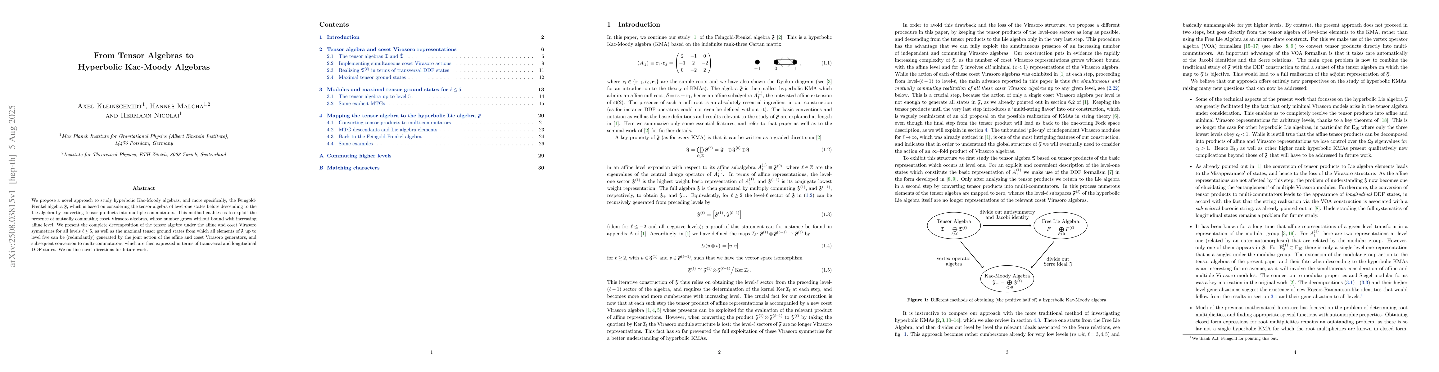 We propose a novel approach to study hyperbolic Kac-Moody algebras, and more specifically, the Feingold-Frenkel algebra $\mathfrak{F}$, which is based on considering the tensor algebra of level-one states before descending to the Lie algebra by converting tensor products into multiple commutators. This method enables us to exploit the presence of mutually commuting coset Virasoro algebras, whose number grows without bound with increasing affine level. We present the complete decomposition of the tensor algebra under the affine and coset Virasoro symmetries for all levels $\ell\leq 5$, as well as the maximal tensor ground states from which all elements of $\mathfrak{F}$ up to level five can be (redundantly) generated by the joint action of the affine and coset Virasoro generators, and subsequent conversion to multi-commutators, which are then expressed in terms of transversal and longitudinal DDF states. We outline novel directions for future work.