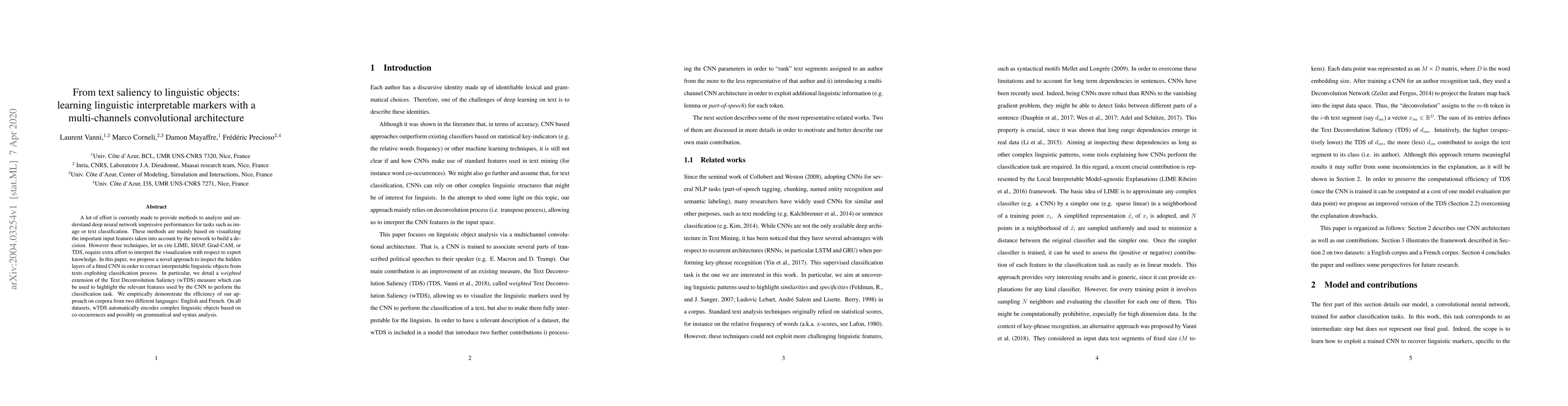 A lot of effort is currently made to provide methods to analyze and understand deep neural network impressive performances for tasks such as image or text classification. These methods are mainly based on visualizing the important input features taken into account by the network to build a decision. However these techniques, let us cite LIME, SHAP, Grad-CAM, or TDS, require extra effort to interpret the visualization with respect to expert knowledge. In this paper, we propose a novel approach to inspect the hidden layers of a fitted CNN in order to extract interpretable linguistic objects from texts exploiting classification process. In particular, we detail a weighted extension of the Text Deconvolution Saliency (wTDS) measure which can be used to highlight the relevant features used by the CNN to perform the classification task. We empirically demonstrate the efficiency of our approach on corpora from two different languages: English and French. On all datasets, wTDS automatically encodes complex linguistic objects based on co-occurrences and possibly on grammatical and syntax analysis.