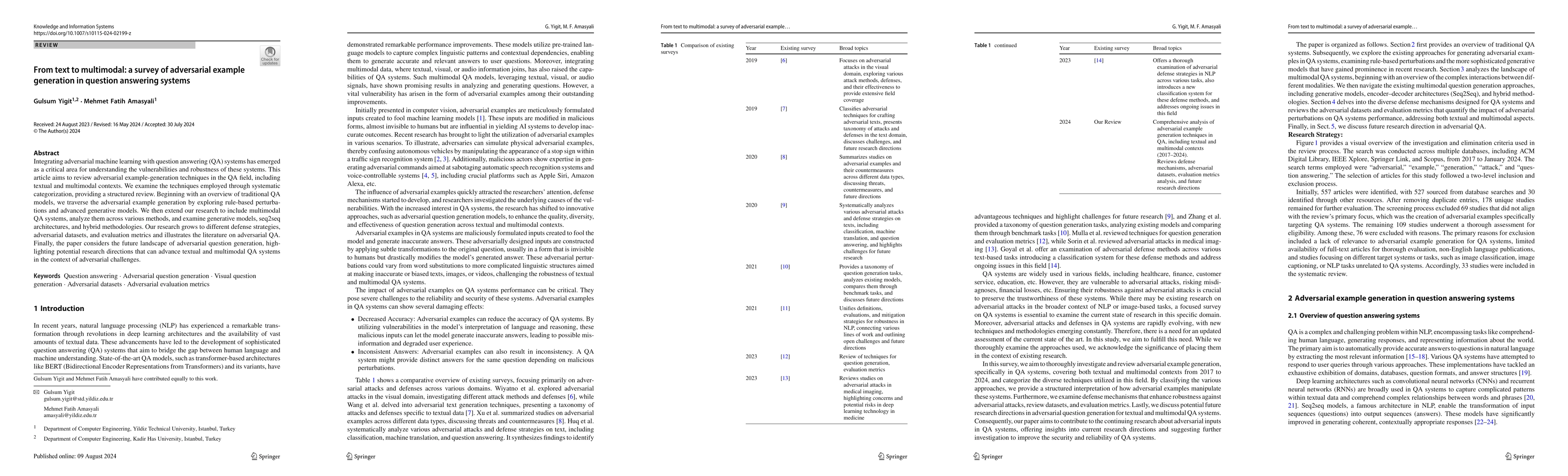 Integrating adversarial machine learning with Question Answering (QA) systems has emerged as a critical area for understanding the vulnerabilities and robustness of these systems. This article aims to comprehensively review adversarial example-generation techniques in the QA field, including textual and multimodal contexts. We examine the techniques employed through systematic categorization, providing a comprehensive, structured review. Beginning with an overview of traditional QA models, we traverse the adversarial example generation by exploring rule-based perturbations and advanced generative models. We then extend our research to include multimodal QA systems, analyze them across various methods, and examine generative models, seq2seq architectures, and hybrid methodologies. Our research grows to different defense strategies, adversarial datasets, and evaluation metrics and illustrates the comprehensive literature on adversarial QA. Finally, the paper considers the future landscape of adversarial question generation, highlighting potential research directions that can advance textual and multimodal QA systems in the context of adversarial challenges.