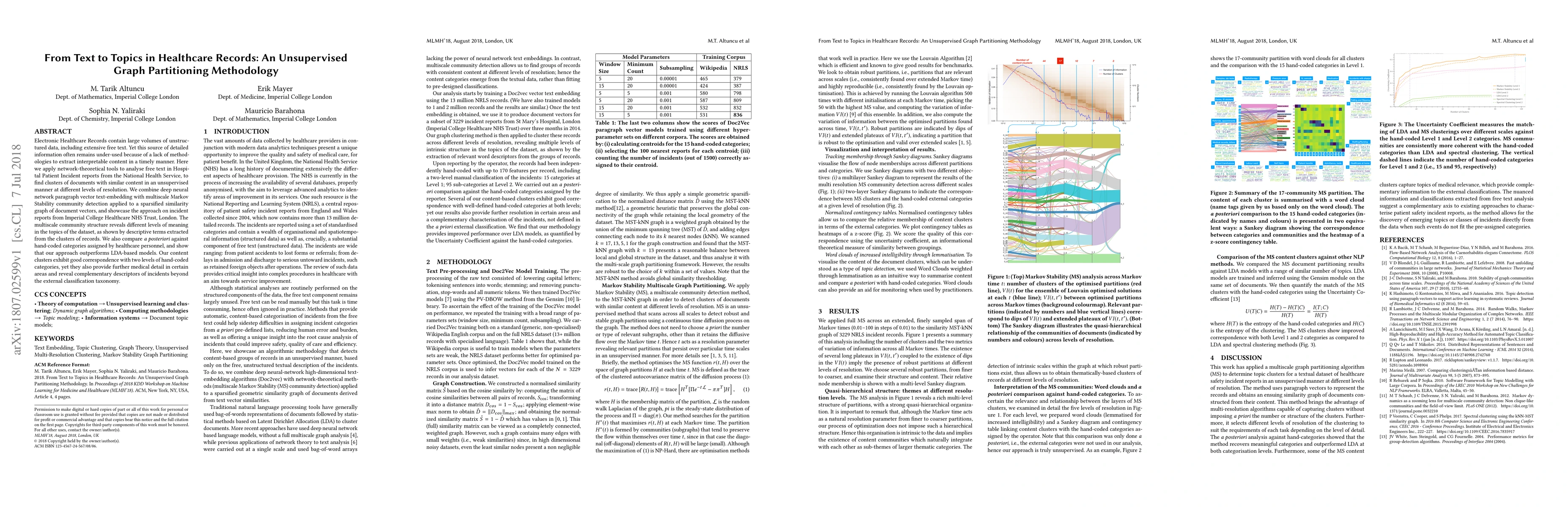 Electronic Healthcare Records contain large volumes of unstructured data, including extensive free text. Yet this source of detailed information often remains under-used because of a lack of methodologies to extract interpretable content in a timely manner. Here we apply network-theoretical tools to analyse free text in Hospital Patient Incident reports from the National Health Service, to find clusters of documents with similar content in an unsupervised manner at different levels of resolution. We combine deep neural network paragraph vector text-embedding with multiscale Markov Stability community detection applied to a sparsified similarity graph of document vectors, and showcase the approach on incident reports from Imperial College Healthcare NHS Trust, London. The multiscale community structure reveals different levels of meaning in the topics of the dataset, as shown by descriptive terms extracted from the clusters of records. We also compare a posteriori against hand-coded categories assigned by healthcare personnel, and show that our approach outperforms LDA-based models. Our content clusters exhibit good correspondence with two levels of hand-coded categories, yet they also provide further medical detail in certain areas and reveal complementary descriptors of incidents beyond the external classification taxonomy.