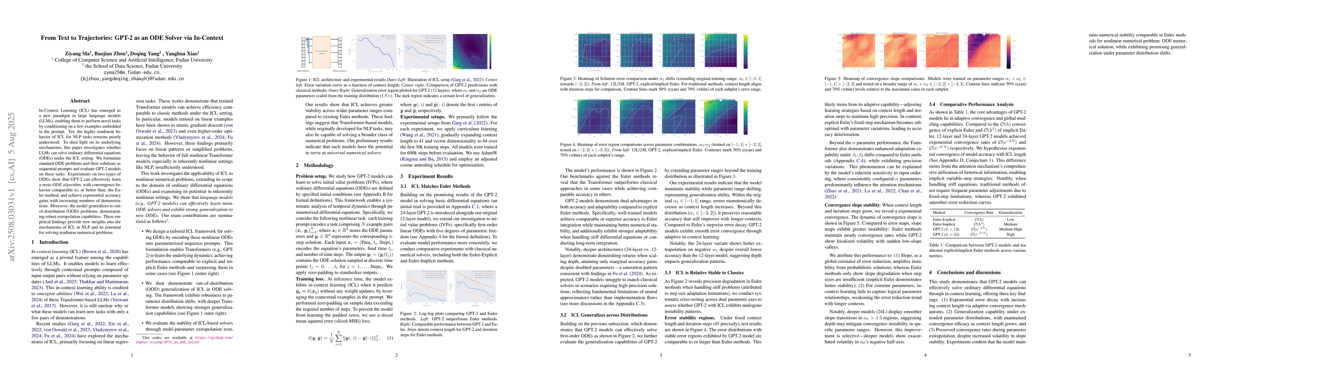 In-Context Learning (ICL) has emerged as a new paradigm in large language models (LLMs), enabling them to perform novel tasks by conditioning on a few examples embedded in the prompt. Yet, the highly nonlinear behavior of ICL for NLP tasks remains poorly understood. To shed light on its underlying mechanisms, this paper investigates whether LLMs can solve ordinary differential equations (ODEs) under the ICL setting. We formulate standard ODE problems and their solutions as sequential prompts and evaluate GPT-2 models on these tasks. Experiments on two types of ODEs show that GPT-2 can effectively learn a meta-ODE algorithm, with convergence behavior comparable to, or better than, the Euler method, and achieve exponential accuracy gains with increasing numbers of demonstrations. Moreover, the model generalizes to out-of-distribution (OOD) problems, demonstrating robust extrapolation capabilities. These empirical findings provide new insights into the mechanisms of ICL in NLP and its potential for solving nonlinear numerical problems.