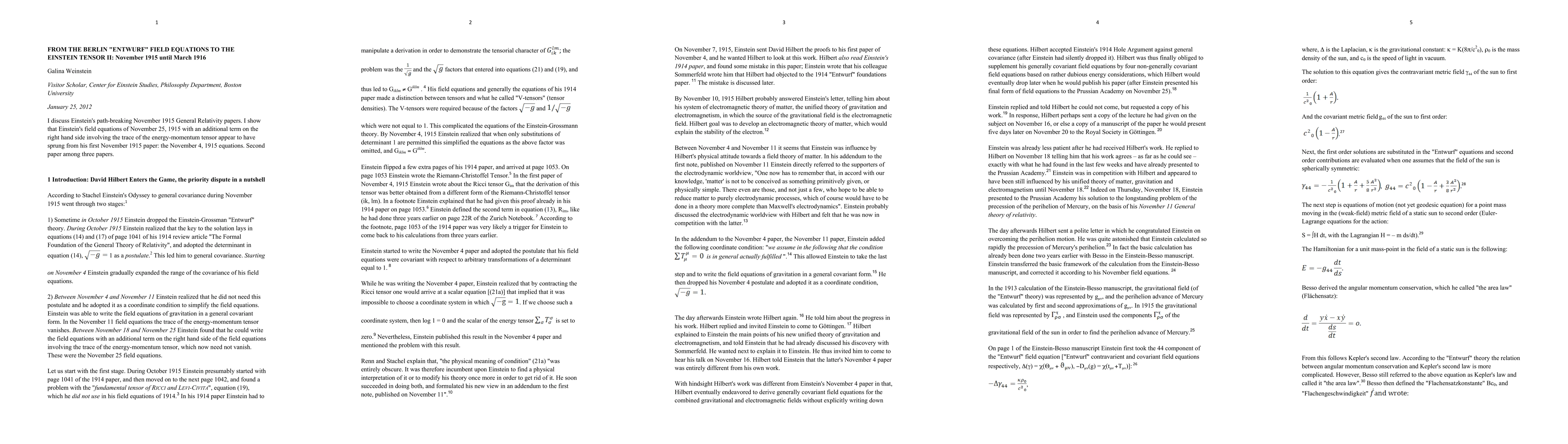 I discuss Einstein's path-breaking November 1915 General Relativity papers. I show that Einstein's field equations of November 25, 1915 with an additional term on the right hand side involving the trace of the energy-momentum tensor appear to have sprung from his first November 1915 paper: the November 4, 1915 equations. Second paper among three papers.