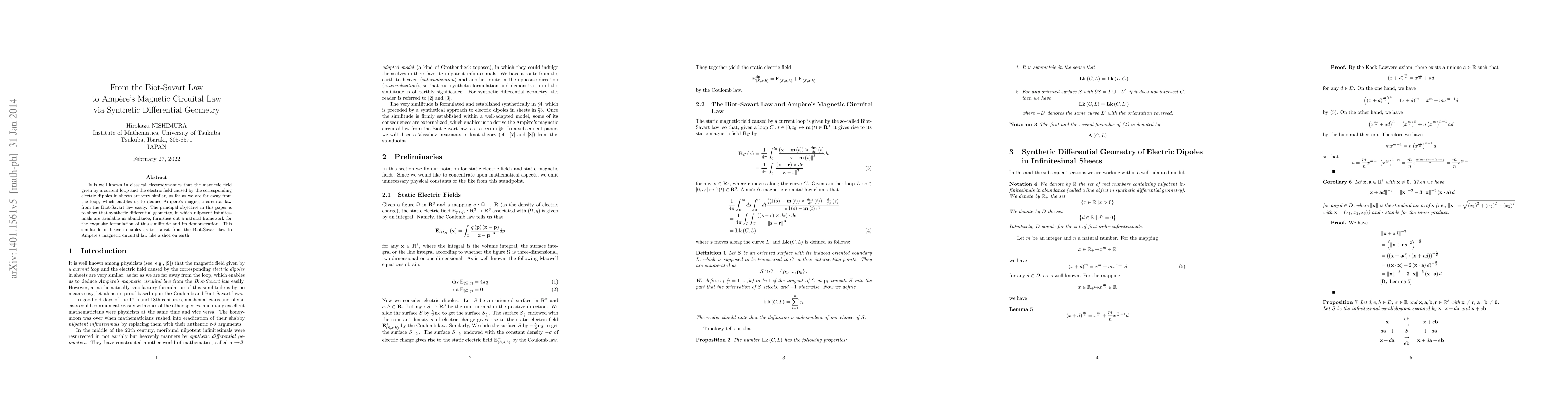 This paper demonstrates how synthetic differential geometry can naturally formulate and prove the transition from the Biot-Savart law to Ampere's magnetic circuital law, leveraging the similarity between magnetic fields from current loops and electric fields from dipole sheets.