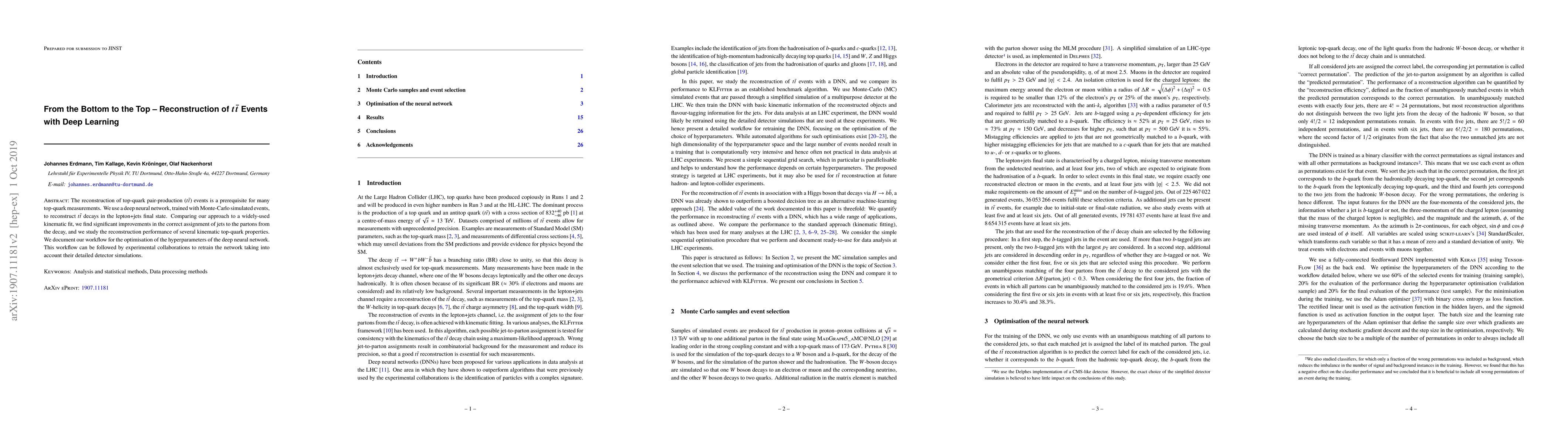 This paper employs a deep neural network to reconstruct $t\bar{t}$ events in the lepton+jets final state, achieving significant improvements over traditional kinematic methods in assigning jets to decay partons. The authors detail a hyperparameter optimization workflow for the neural network, which can be adapted for use by other experimental collaborations.