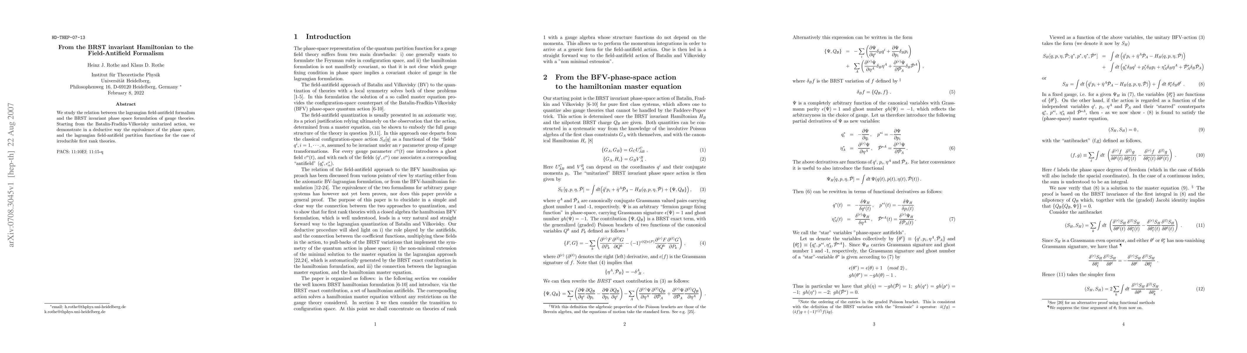 This paper establishes the equivalence between the BRST invariant Hamiltonian formulation and the Lagrangian field-antifield formalism in gauge theories. It demonstrates this through the Batalin-Fradkin-Vilkovisky unitarized action, focusing on irreducible first rank theories.