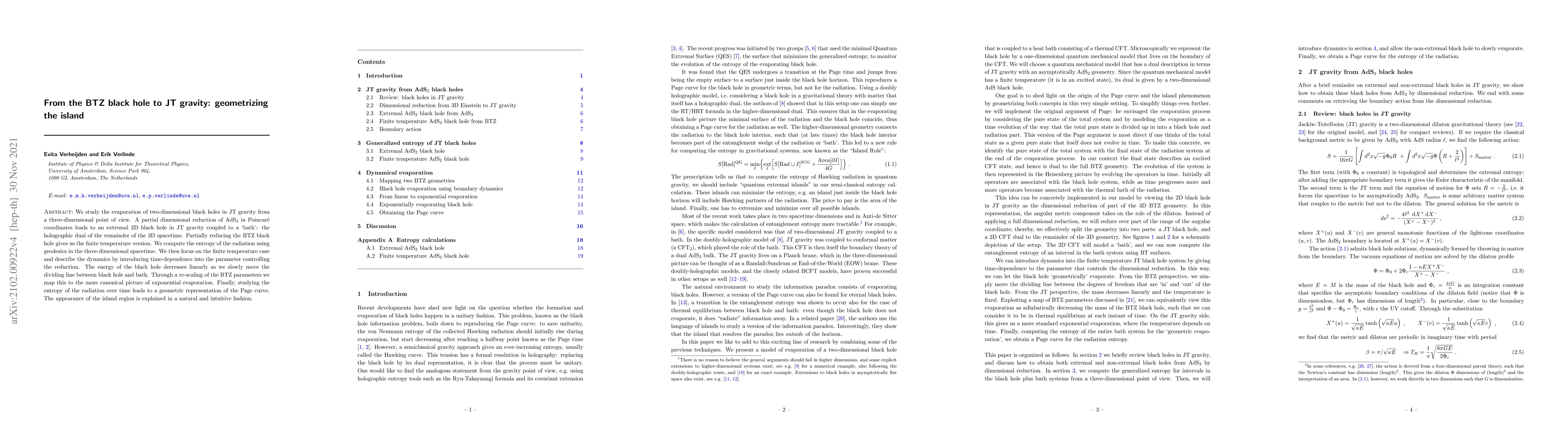 Researchers studied the evaporation of 2D black holes in JT gravity from a 3D perspective, discovering that as they approach finite temperature, their energy decreases linearly, leading to a geometric representation of the Page curve.