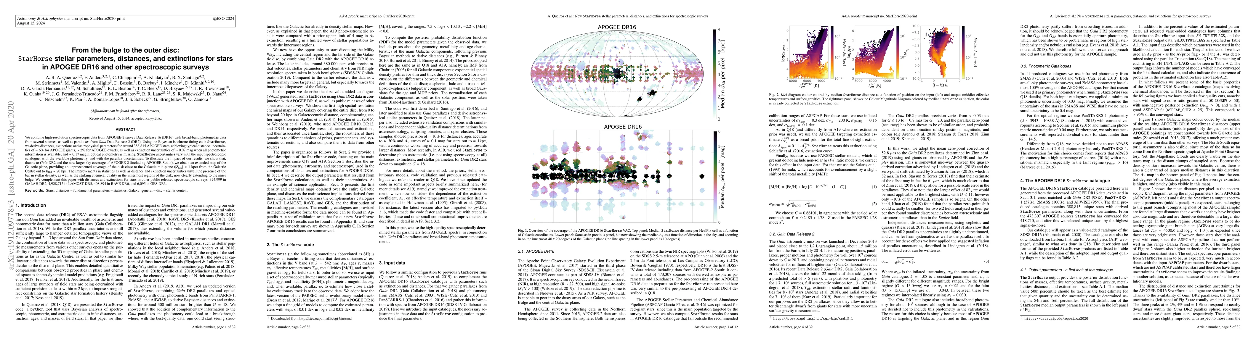 We combine high-resolution spectroscopic data from APOGEE-2 Survey Data Release 16 (DR16) with broad-band photometric data from several sources, as well as parallaxes from {\it Gaia} Data Release 2 (DR2). Using the Bayesian isochrone-fitting code {\tt StarHorse}, we derive distances, extinctions and astrophysical parameters for around 388,815 APOGEE stars, achieving typical distance uncertainties of $\sim 6\%$ for APOGEE giants, $\sim 2\%$ for APOGEE dwarfs, as well as extinction uncertainties of $\sim 0.07$ mag when all photometric information is available, and $\sim 0.17$ mag if optical photometry is missing. {\tt StarHorse} uncertainties vary with the input spectroscopic catalogue, with the available photometry, and with the parallax uncertainties. To illustrate the impact of our results, we show that, thanks to {\it Gaia} DR2 and the now larger sky coverage of APOGEE-2 (including APOGEE-South), we obtain an extended map of the Galactic plane, providing unprecedented coverage of the disk close to the Galactic mid-plane ($|Z_{Gal}|<1$ kpc) from the Galactic Centre out to $R_{\rm Gal}\sim 20$ kpc. The improvements in statistics as well as distance and extinction uncertainties unveil the presence of the bar in stellar density, as well as the striking chemical duality in the innermost regions of the disk, now clearly extending to the inner bulge. We complement this paper with distances and extinctions for stars in other public released spectroscopic surveys: 324,999 in GALAH DR2, 4,928,715 in LAMOST DR5, 408,894 in RAVE DR6, and 6,095 in GES DR3