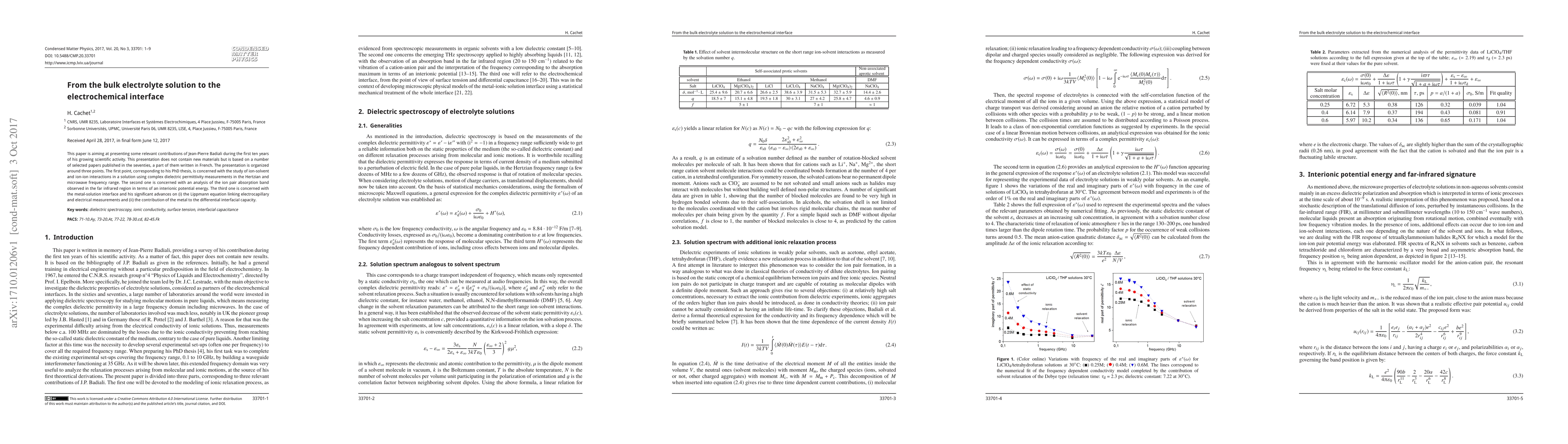 This paper is aiming at presenting some relevant contributions of Jean-Pierre Badiali during the first ten years of his growing scientific activity. This presentation does not contain new materials but is based on a number of selected papers published in the seventies, a part of them written in French. The presentation is organized around three points. The first point, corresponding to his PhD thesis, is concerned with the study of ion-solvent and ion-ion interactions in a solution using complex dielectric permittivity measurements in the Hertzian and microwave frequency range. The second one is concerned with an analysis of the ion pair absorption band observed in the far infrared region in terms of an interionic potential energy. The third one is concerned with the metal-solution interface and his significant advances on (i) the Lippmann equation linking electrocapillary and electrical measurements and (ii) the contribution of the metal to the differential interfacial capacity.