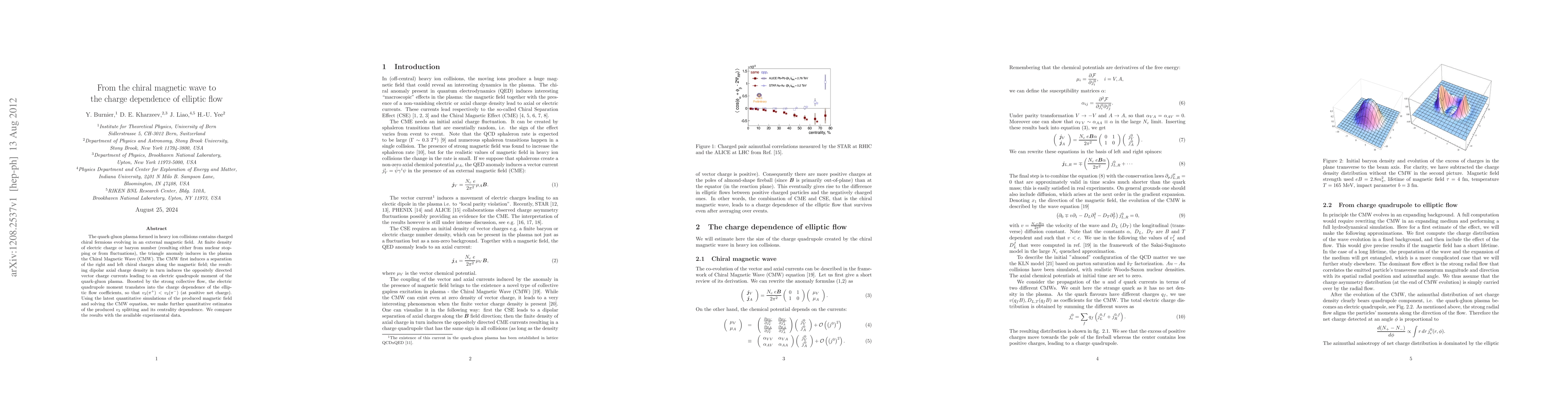 The quark-gluon plasma formed in heavy ion collisions contains charged chiral fermions evolving in an external magnetic field. At finite density of electric charge or baryon number (resulting either from nuclear stopping or from fluctuations), the triangle anomaly induces in the plasma the Chiral Magnetic Wave (CMW). The CMW first induces a separation of the right and left chiral charges along the magnetic field; the resulting dipolar axial charge density in turn induces the oppositely directed vector charge currents leading to an electric quadrupole moment of the quark-gluon plasma. Boosted by the strong collective flow, the electric quadrupole moment translates into the charge dependence of the elliptic flow coefficients, so that $v_2(\pi^+) < v_2(\pi^-)$ (at positive net charge). Using the latest quantitative simulations of the produced magnetic field and solving the CMW equation, we make further quantitative estimates of the produced $v_2$ splitting and its centrality dependence. We compare the results with the available experimental data.